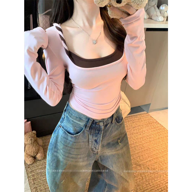 纯欲辣妹反转心结大方领撞色扭结假两件修身长袖打底衫T恤女上衣