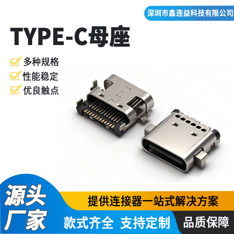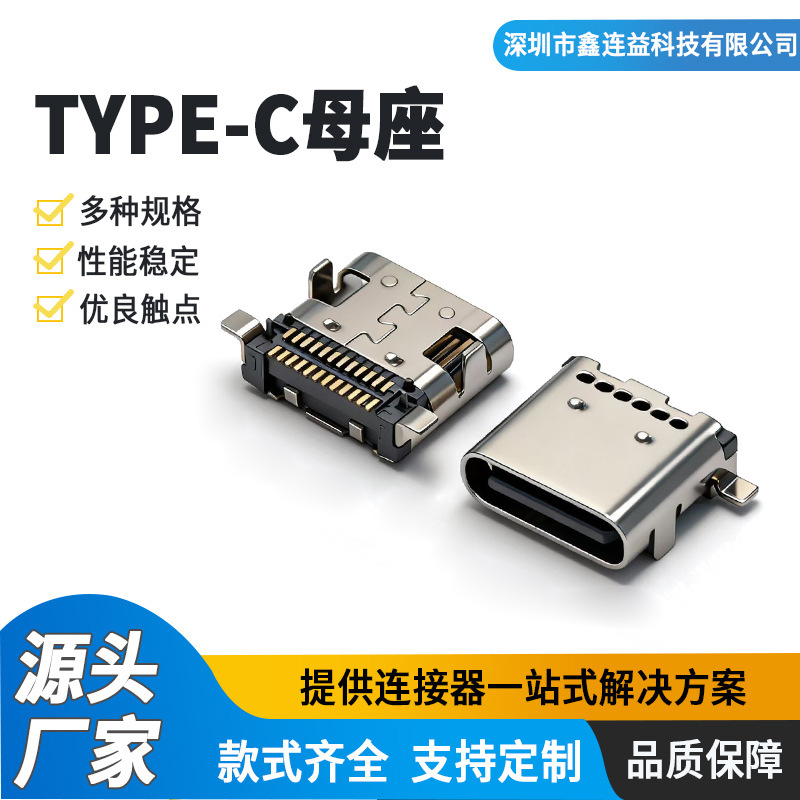 USB3.1满pin TYPE-C侧立式母座24P 侧贴四脚插件双排SMT