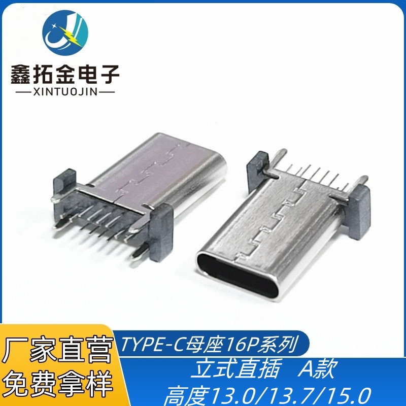 USBTYPE-C插件母座16P 立式插板H=13.0/13.7/15.0四脚插板DIP A款