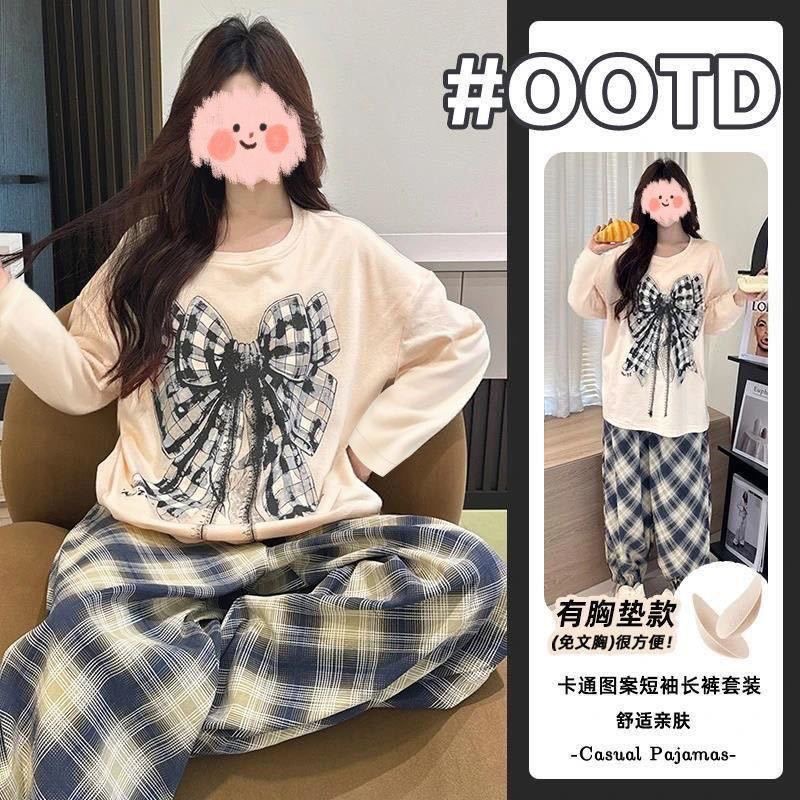 胸パッド付きパジャマ女性用夏2025新型薄手半袖七分ズボン韓国版プラスサイズ家庭服セット