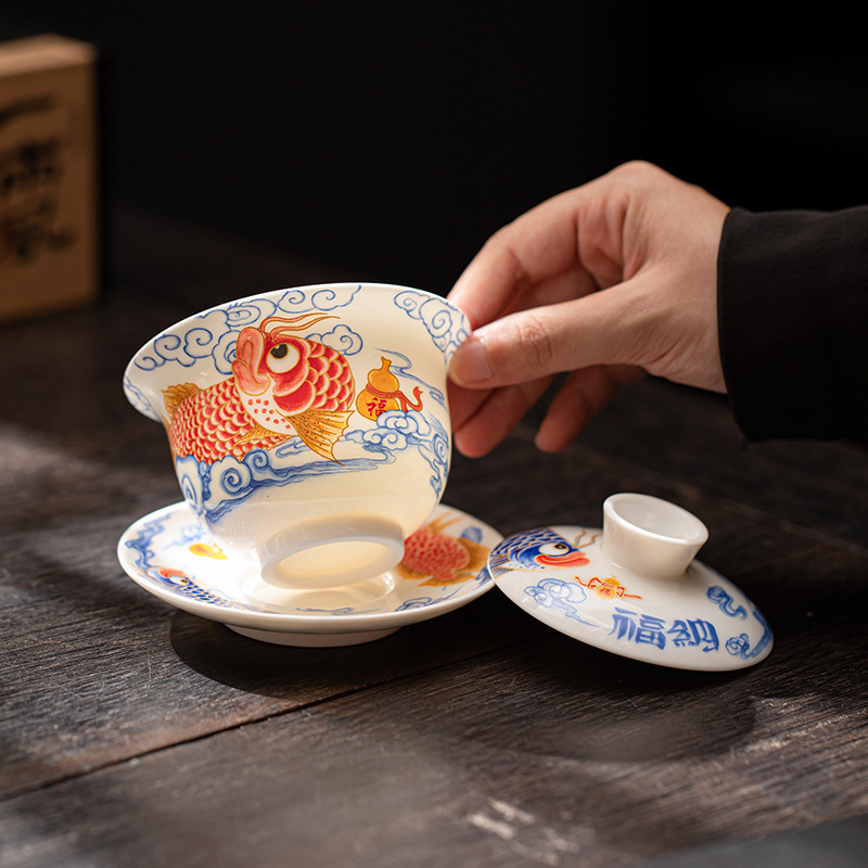 回転式アロワナカバーボウルティーカップティーセットシングル高級羊脂翡翠三才ティーボウル蓋付き