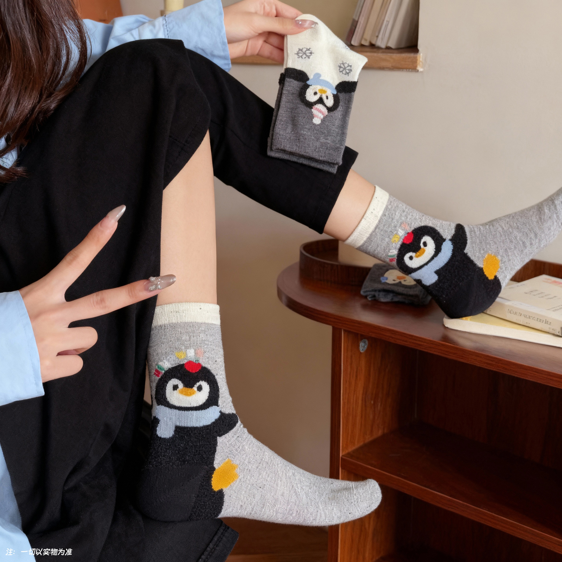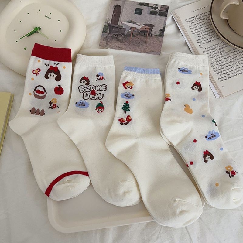 秋冬袜子女 卡通花生企鹅中筒女袜 ins潮韩版可爱学院风白色袜