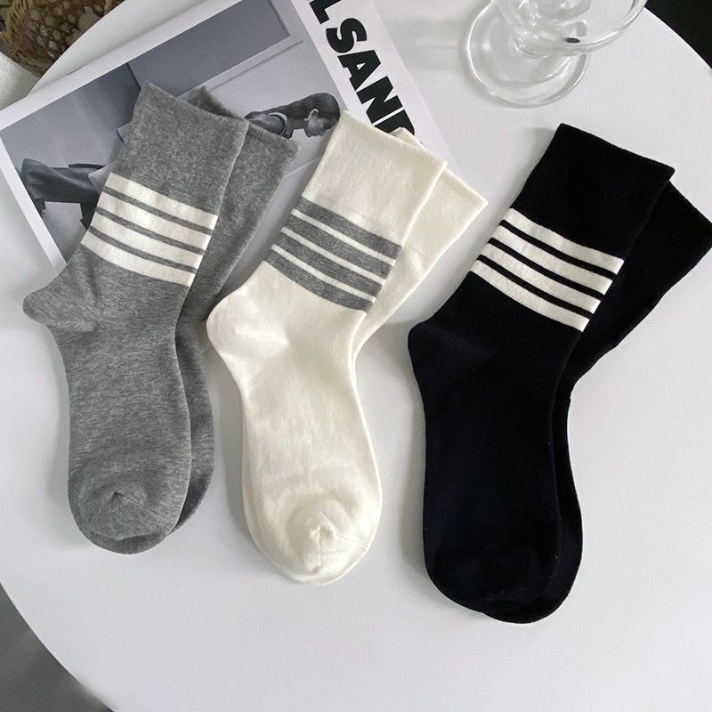 ミドルソックスレディース春夏ストッキング黒と白グレー靴下レディースストライプソックススポーツソックス4バースタッキングソックス
