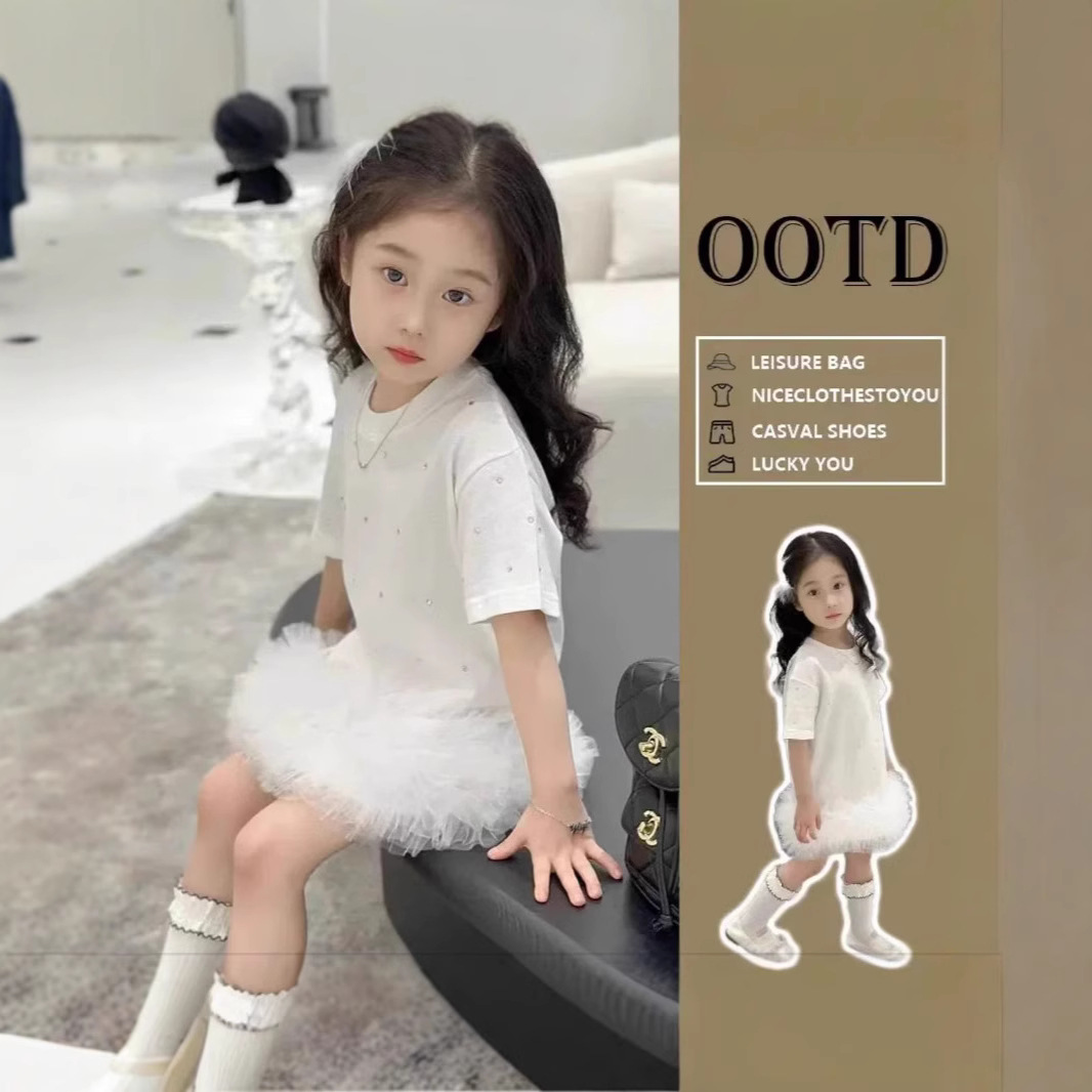 夏の女の子のフレンチコットンTシャツドレスベビーガール新しいスタイルの甘いメッシュスプライシング新しいドレス