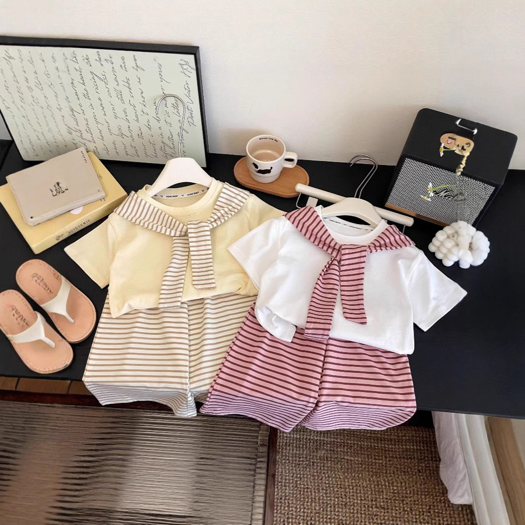 子供用夏の新作可愛いセット 純綿半袖ストライプパンツ2点セット(スカーフ付き)ラウンドネック
