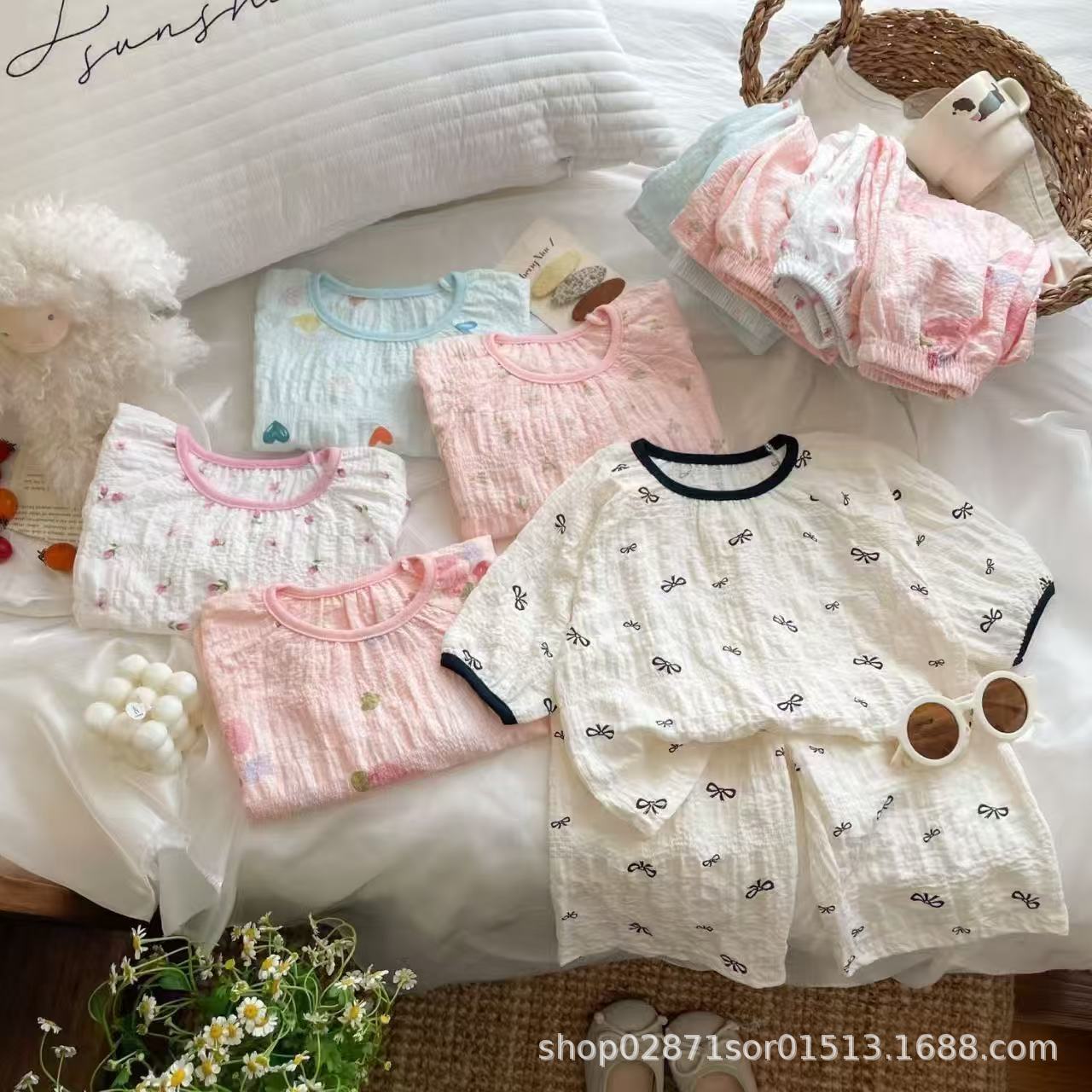 子供の家の服のスーツの夏の新型の純綿2025男の子のパジャマの女の子のエアコンの服の赤ちゃんの夏のタイプの子供服