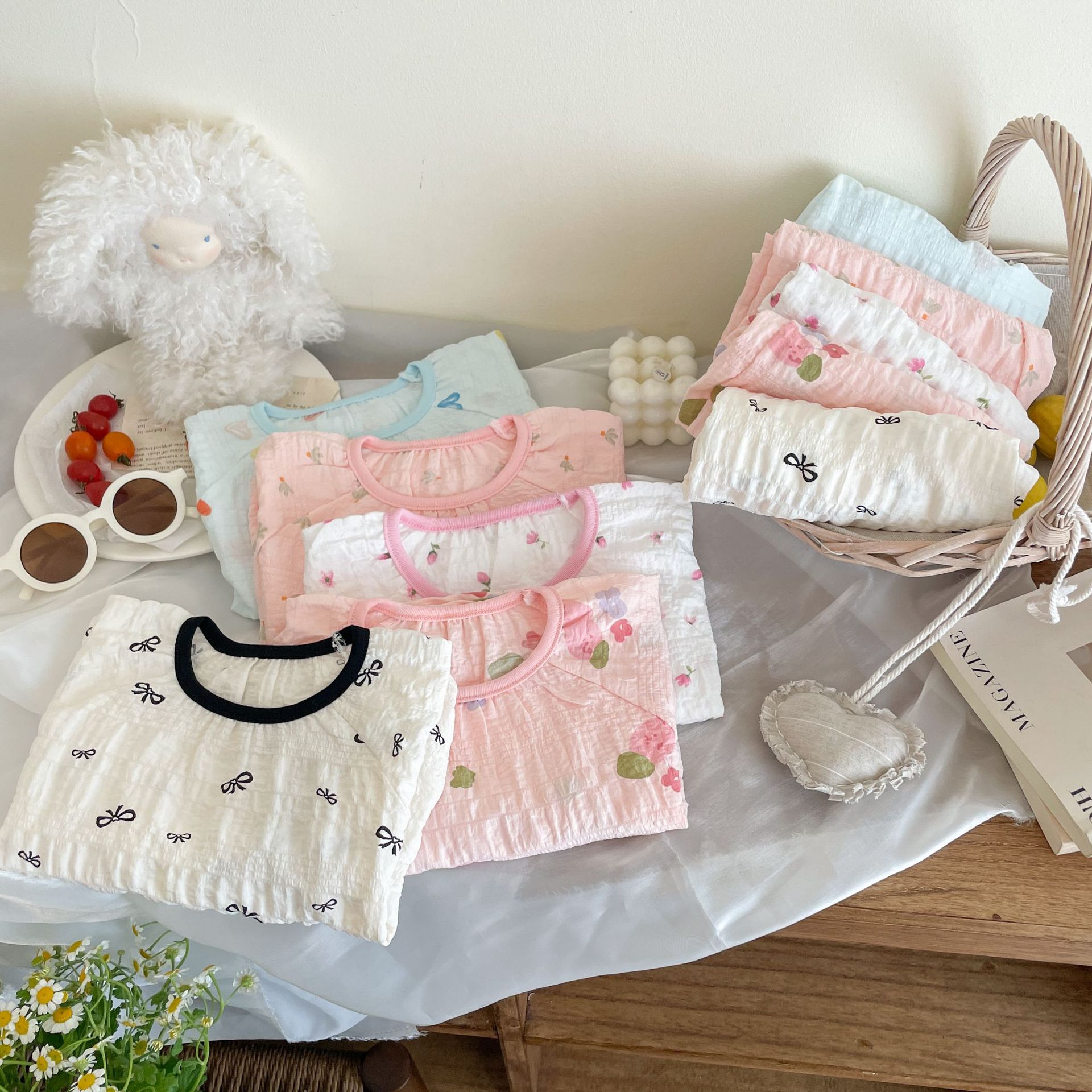 7A タイムコットン 薄手 ホームエアコン服 五分袖 七分丈パンツ 外出着セット 女の子 子供用