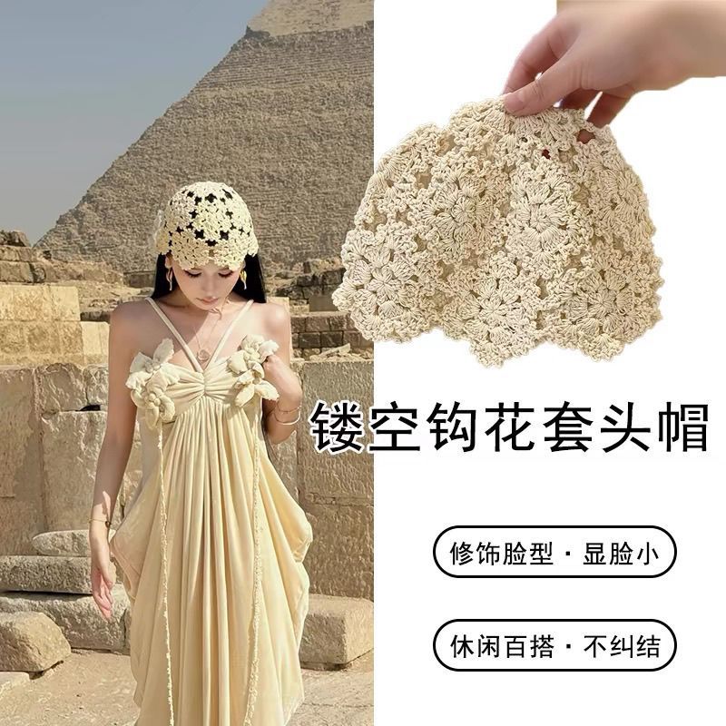 女性用中空大花ニット帽、春包頭ニット帽、ファッショナブルで多用途、顔が見える小さな女性用夏かぎ針編み帽子