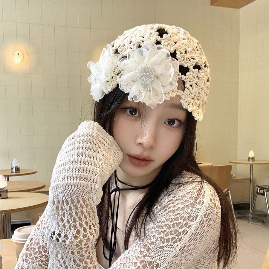 新しい日本製の薄い手作りかぎ針編みパイル帽子女性のための春と夏のレースの花ファッショナブルな包頭帽子レース