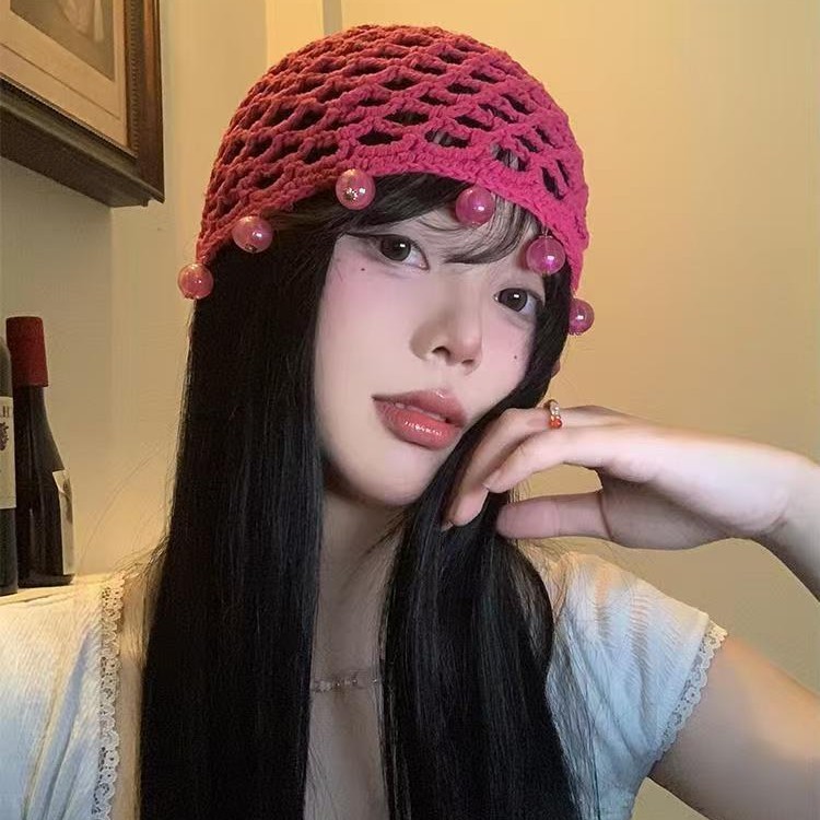 椿の女手織り中空ビーズつば帽子女性のための 2024 春と夏の新しいボヘミアンスタイルニット帽子