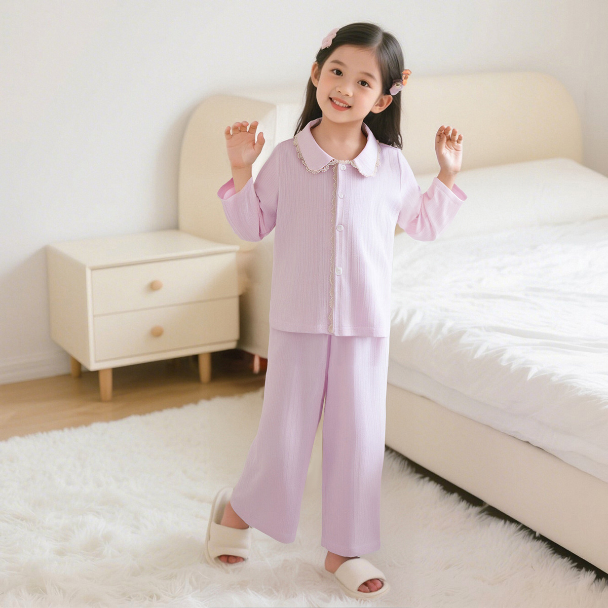 女童春秋长袖纯棉睡衣公主风套装中大童女孩蕾丝娃娃领家居服全棉