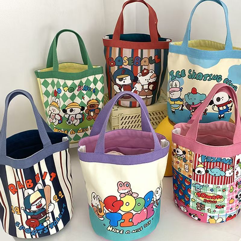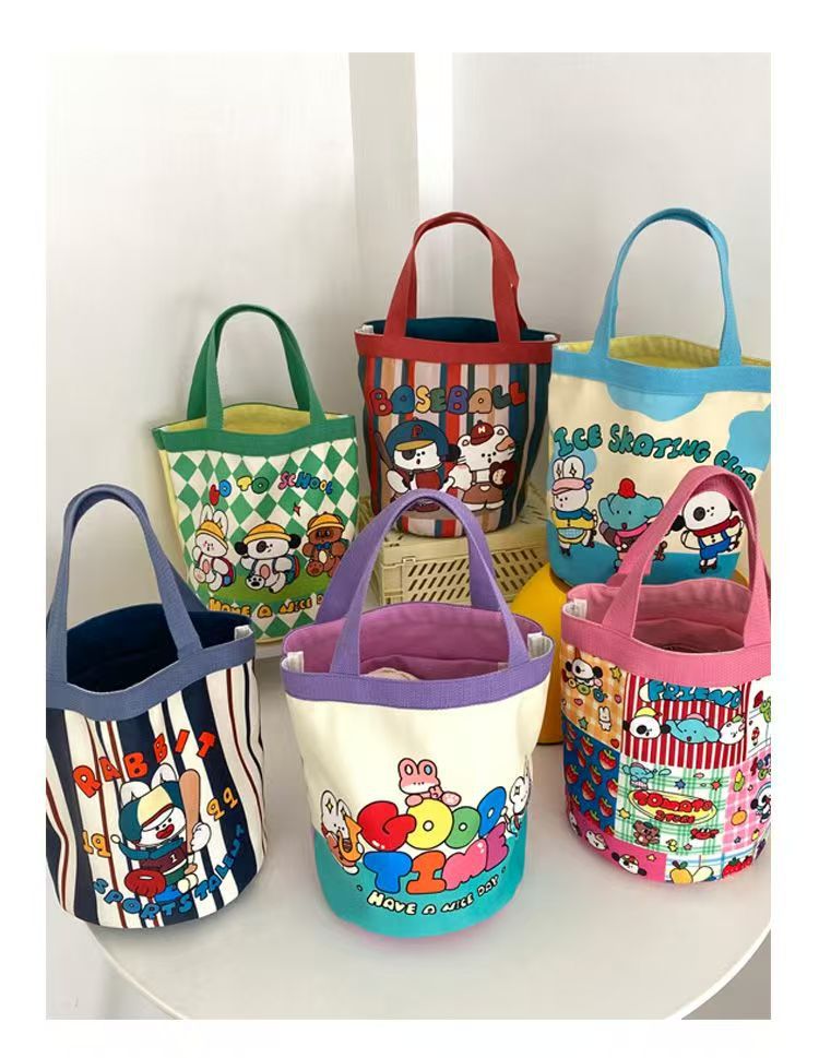 かわいいアート風水桶型ハンドバッグ、韓国風ガーリーなママ向け弁当バッグ、仕事用バッグ、子供っぽいキャンバスバッグ、持ち運びに便利。