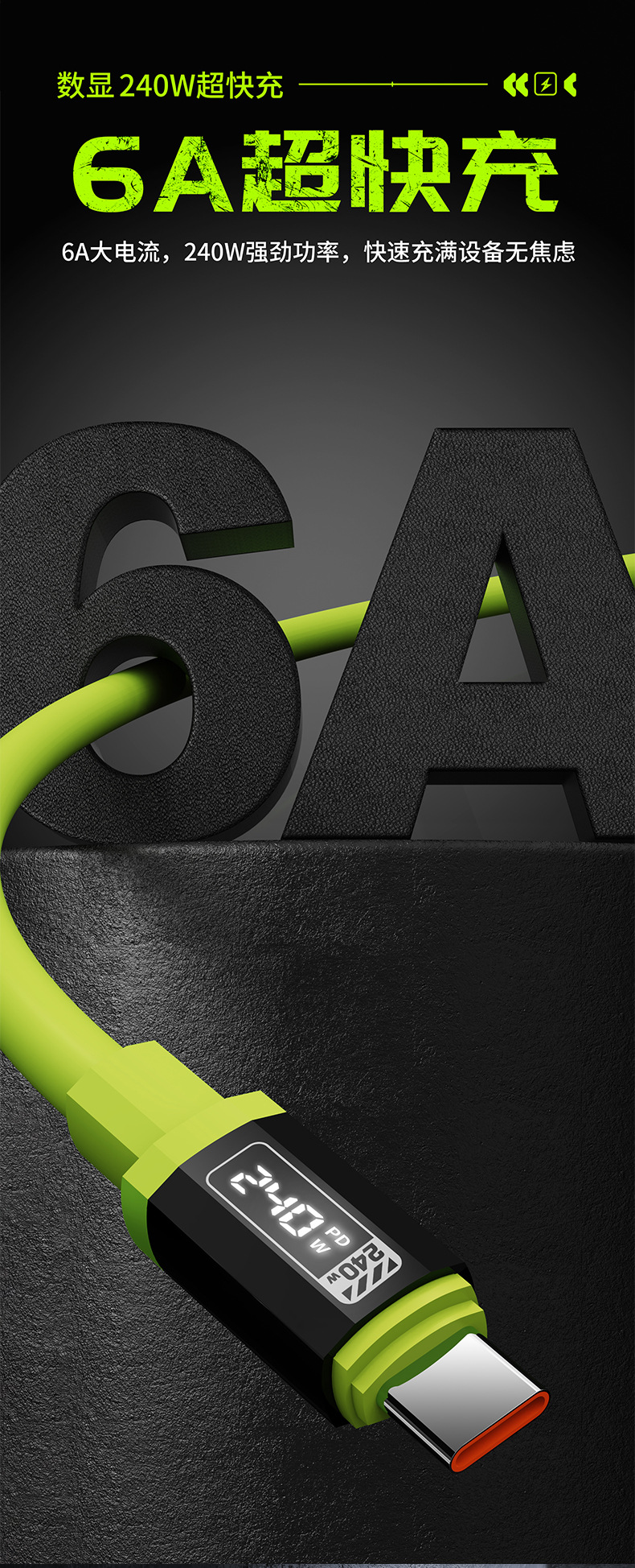 【工場直販】6A透明デジタルディスプレイ付きType-Cデータケーブル 240W急速充電対応 Huawei/Apple充電ケーブル