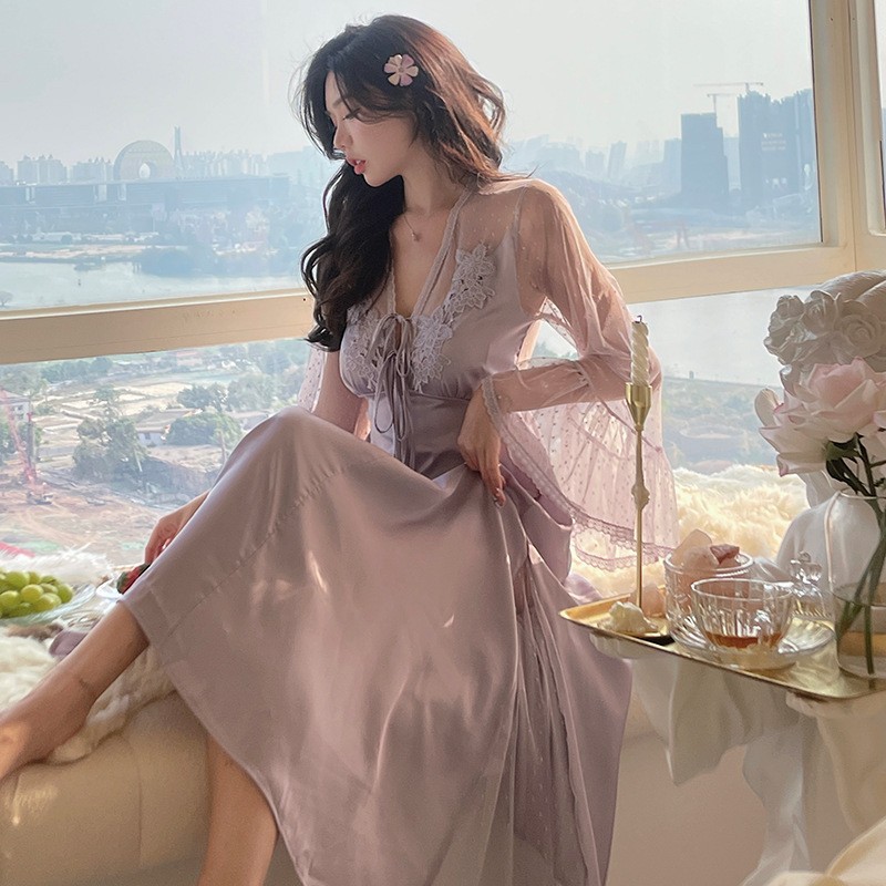 2023レースのパジャマの女性春夏長袖の透かし彫りのセクシーな長いタイプの胸のパッドの氷の糸の眠るスカートの仙気はふわふわしています。