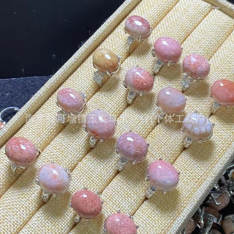天然珊瑚玉戒指活口设计可调节镶嵌满花通透彩花水晶戒指女饰品
