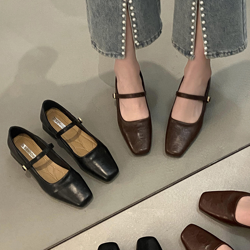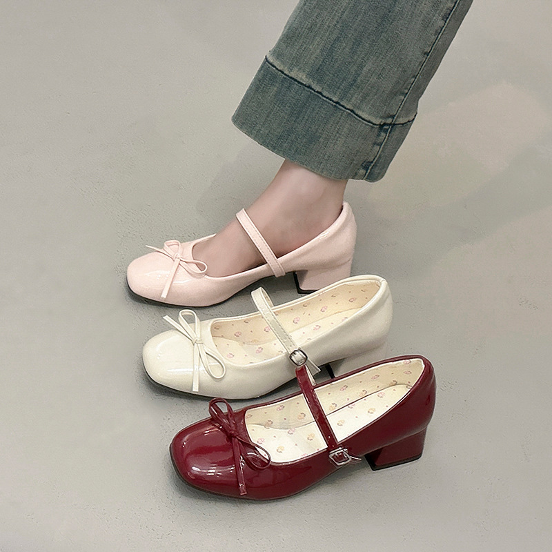 ボトムヒールリボンシューズ春万能レディースヒール2025フレンチ新作2025パテントレザーメリージェーンシューズ