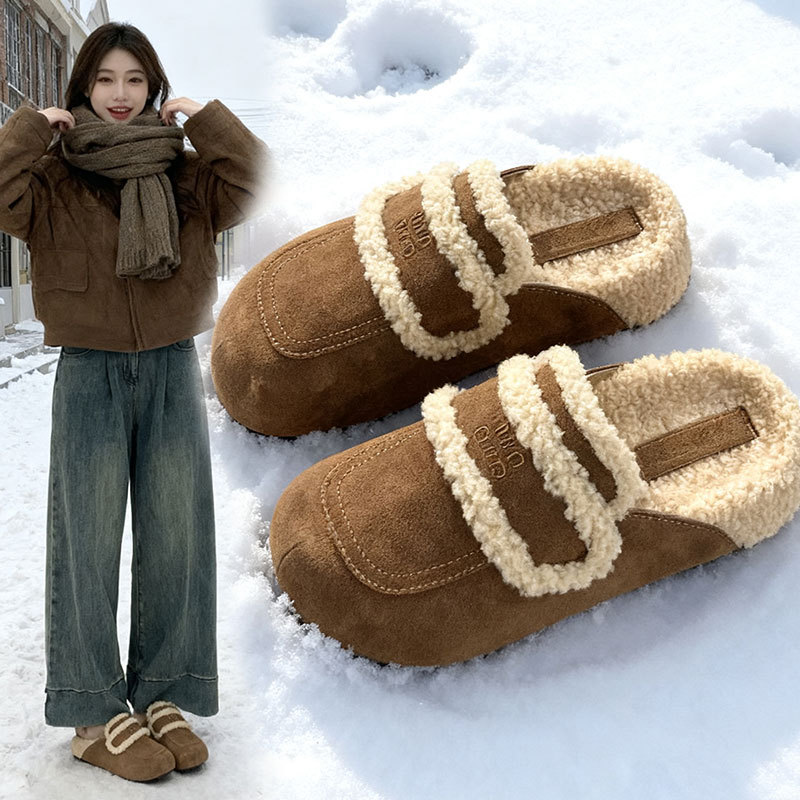 厚底增高包头半拖鞋女25新款秋冬季复古加绒保暖懒人一脚蹬棉鞋JX