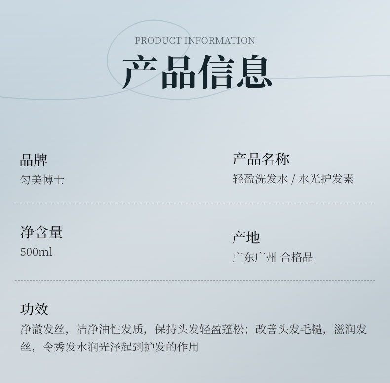 匀美博士轻盈洗发水与水光护发素套装控油轻盈去屑止痒洗发露液