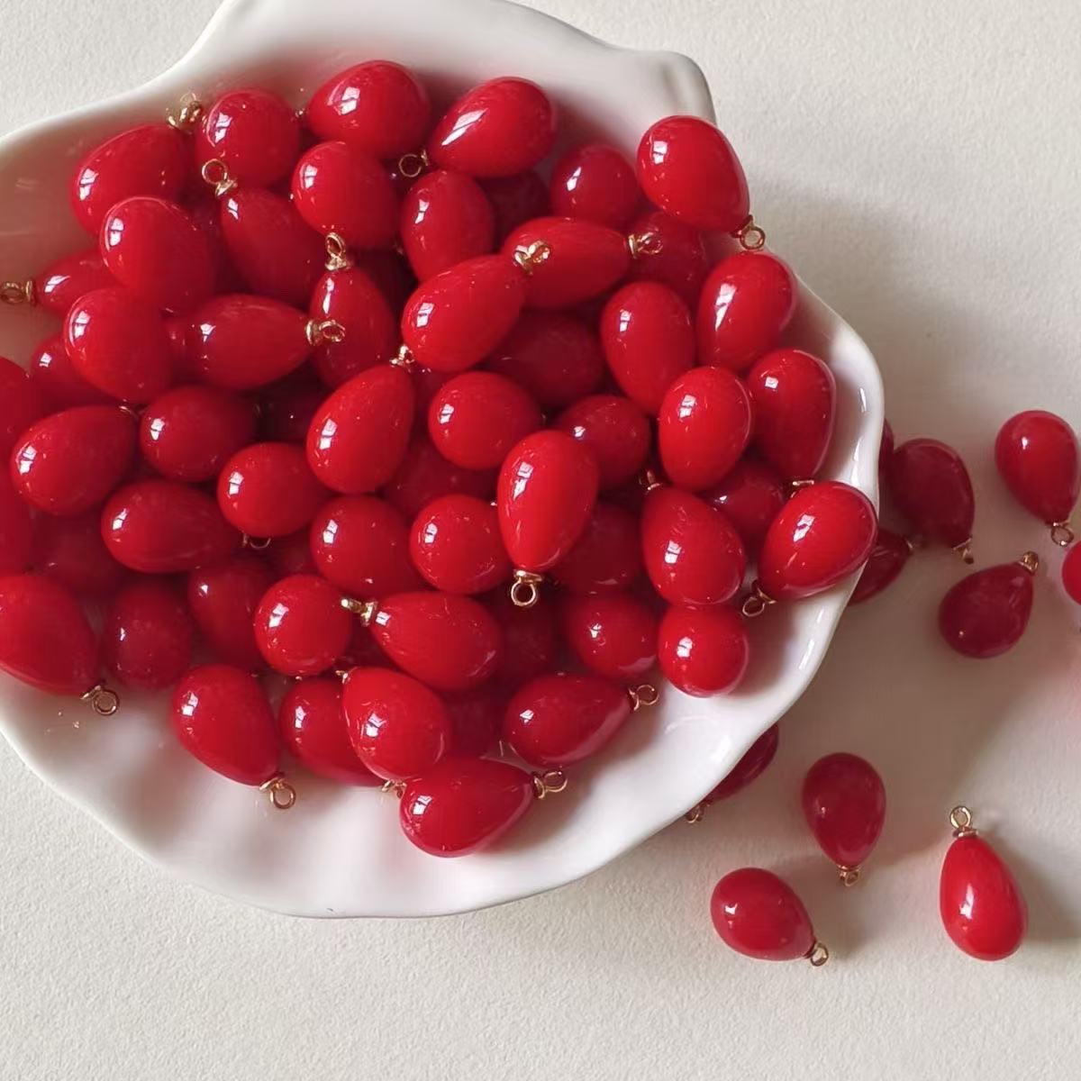 10*14mm樱桃红水滴吊坠 喜庆大红色水滴型羊眼塑料仿珍珠坠子饰配
