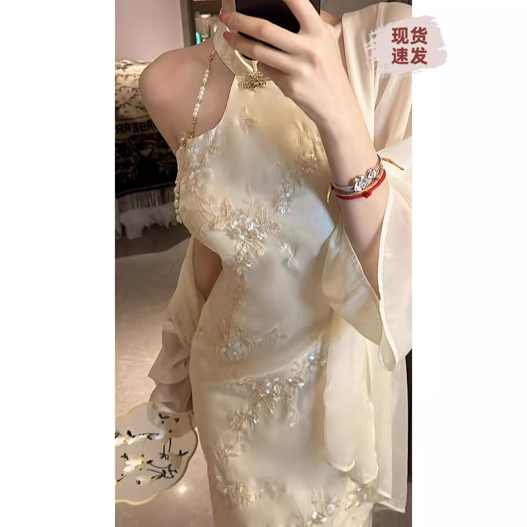 2025年夏新作 新中式風 ウエストシェイプ ホルターネック ノースリーブ スリット入り 細見えワンピース ヒップカバー チャイナドレス レディース