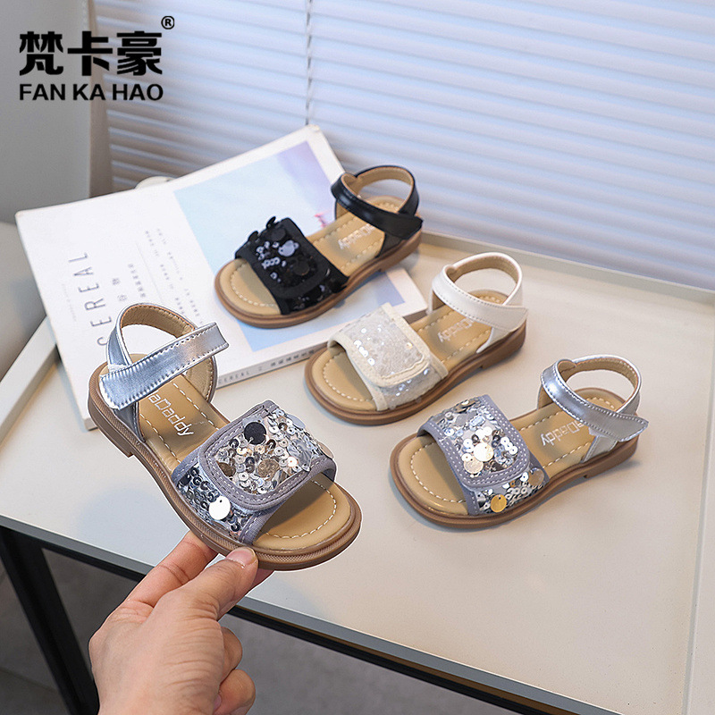 梵卡豪の大衆は女の子のファッションのスパンコールの王女のサンダルの2025夏の新型の子供の柔らかい底のビーチの靴を設計します。