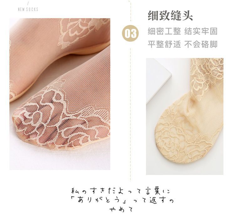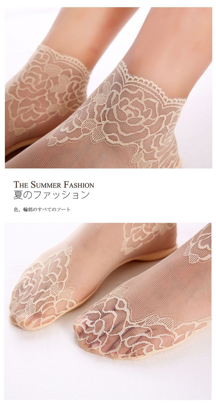 夏用ローズ柄レースインビジブルボートソックス、脱げないレディース浅履き綿底滑り止めショートソックス、ハイヒール用ソックス