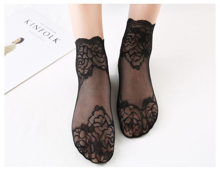 レースソックス女性のレースミッドカーフソックス春と秋の綿底イントレンディな黒の夏薄い通気性ショートストッキング