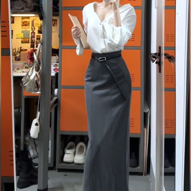 高級感雰囲気通勤白vネック長袖シャツ女性春ファッション百合半身ロングスカートお姉さんセット
