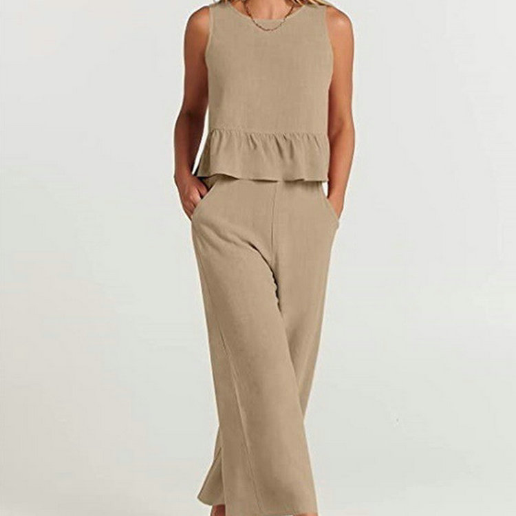 2025 夏の新ファッション薄いヨーロッパとアメリカの女性の無地ノースリーブプリーツワイドレッグベスト 9 点パンツカジュアルスーツ