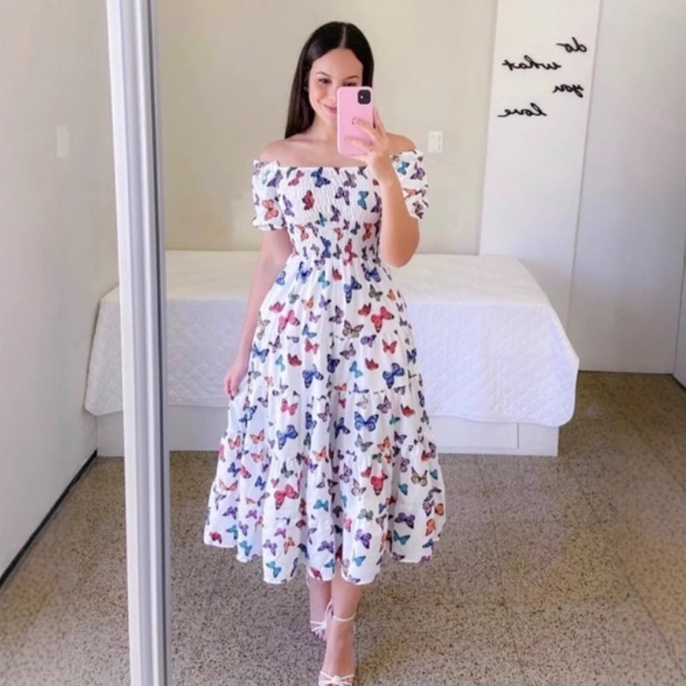 2025年クロスボーダー春夏新作アマゾンヨーロッパとアメリカのプリントフレンチスイートドレスワンショルダー花柄オフショルダーフェアリードレス