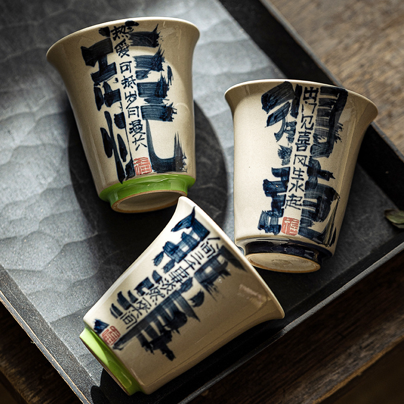草木灰釉薬下彩手書き香りカップ陶磁器家庭用お茶カップレトロ日本風工夫茶器カップギフトボックス