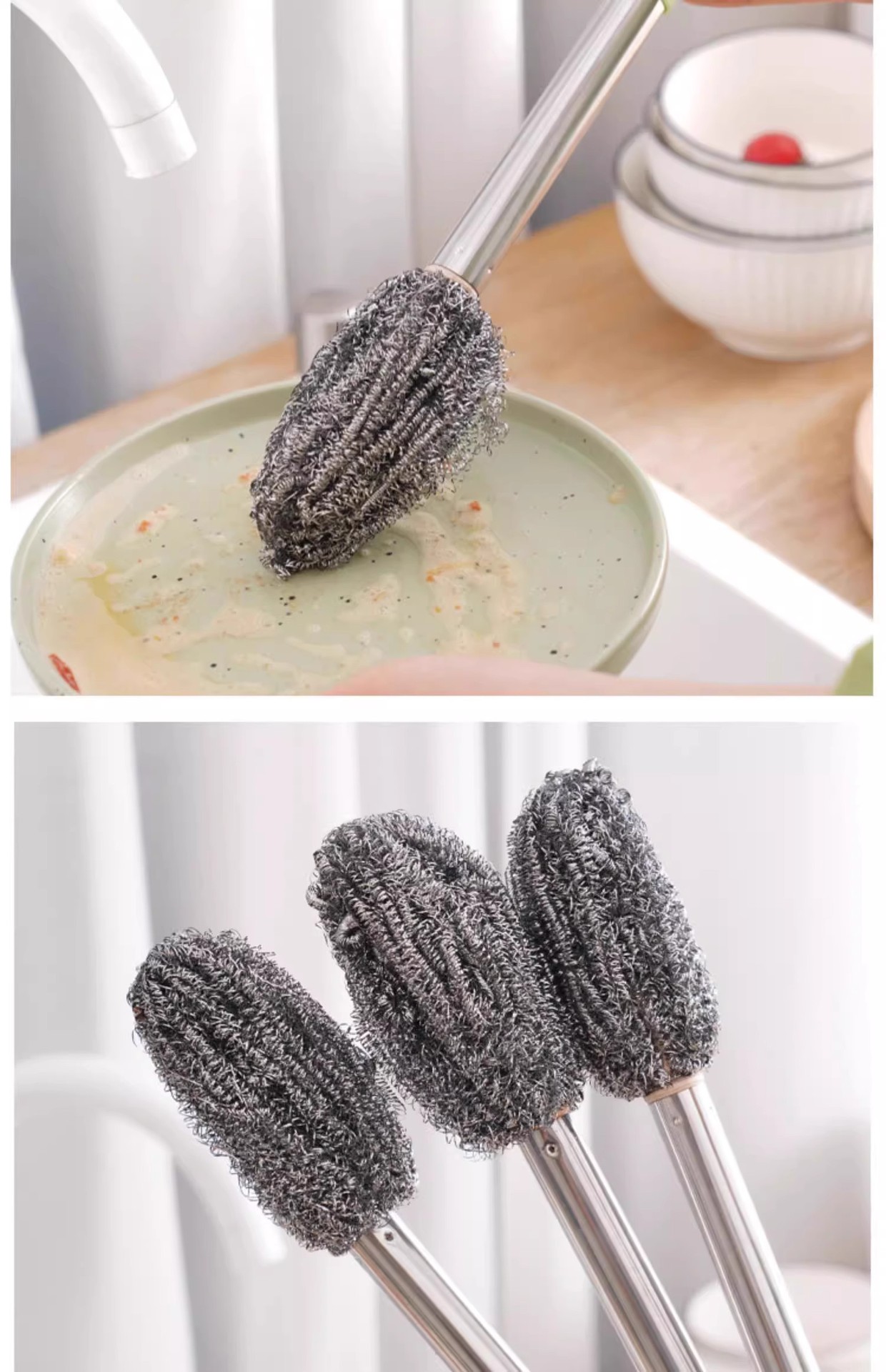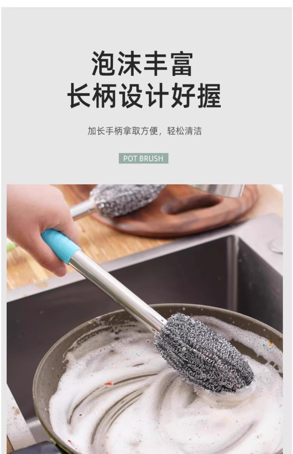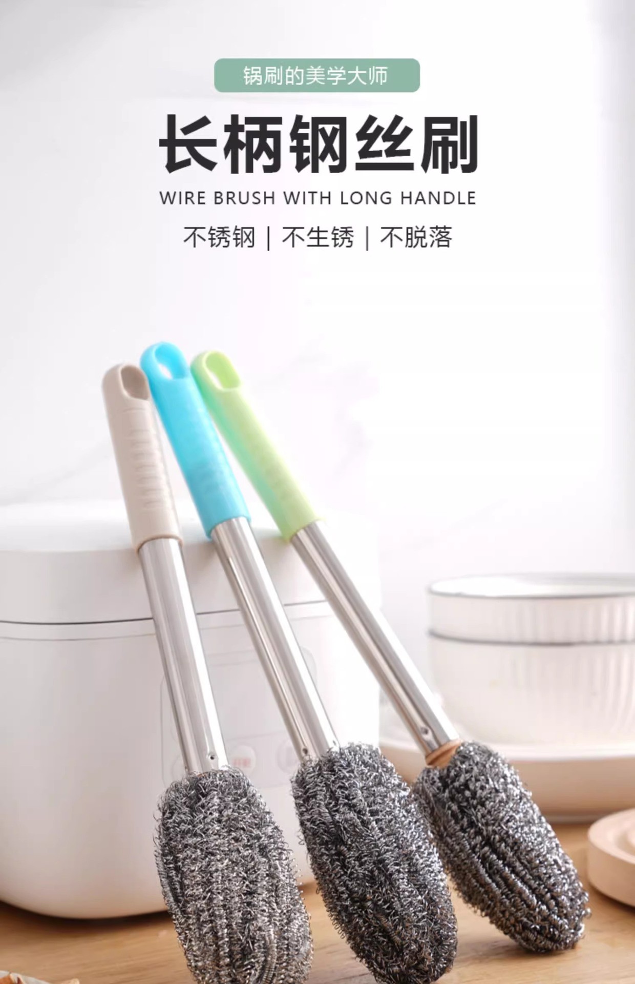 柄付きワイヤーボールブラシの長い棒で鍋を洗って錆びないで台所をきれいにします。