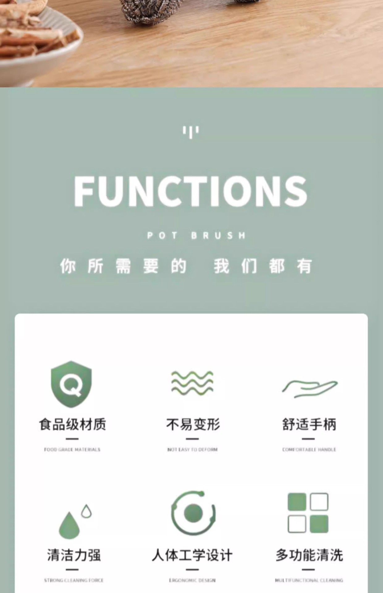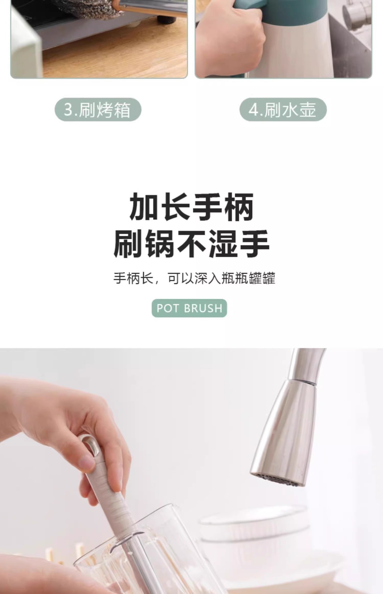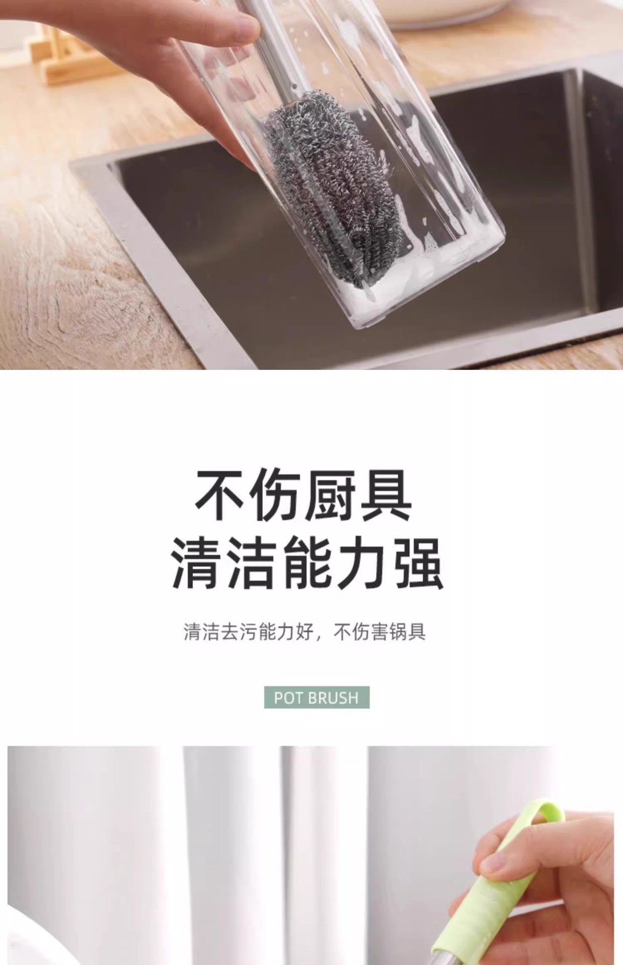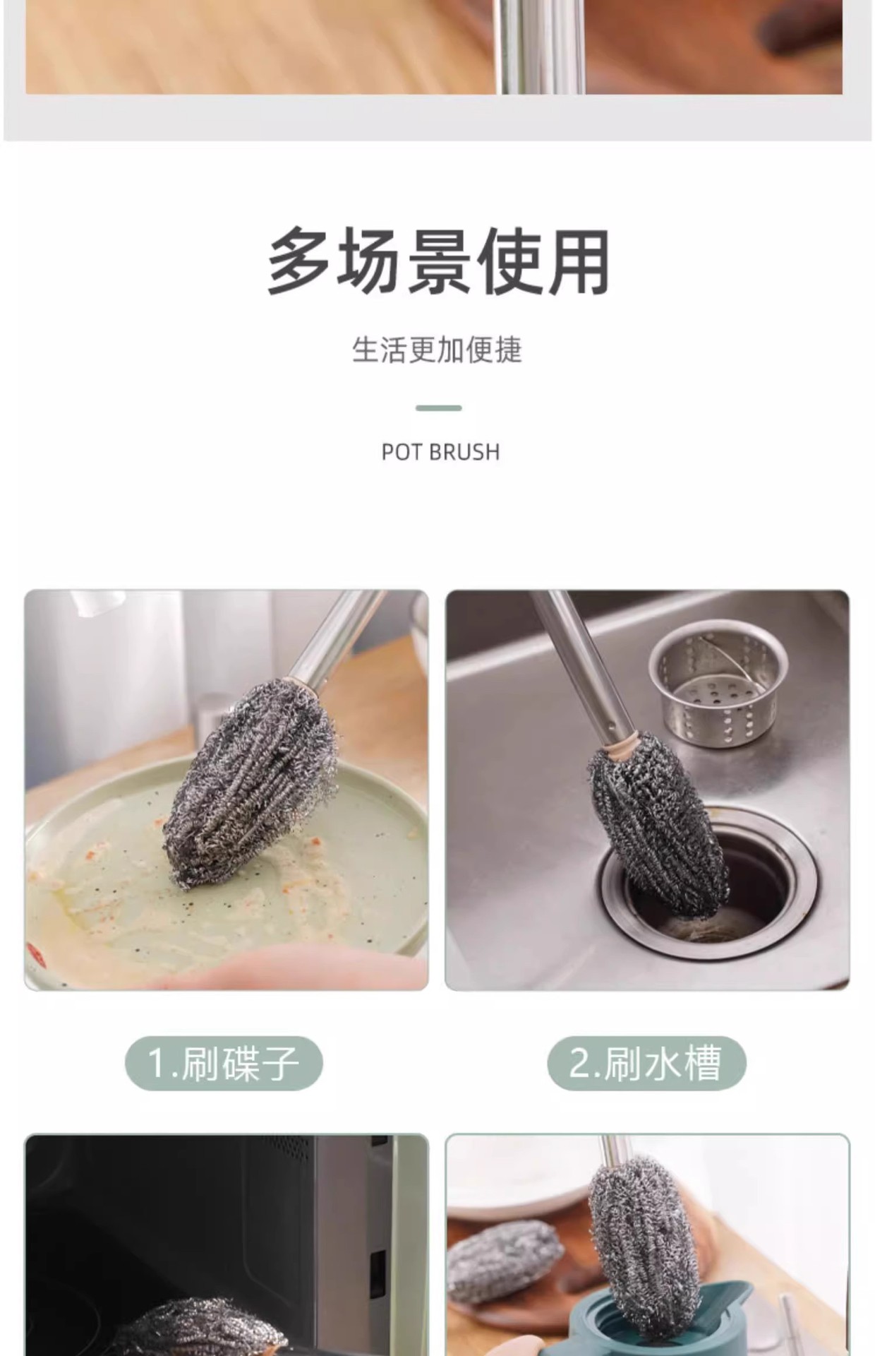 柄付きワイヤーボールブラシの長い棒で鍋を洗って錆びないで台所をきれいにします。