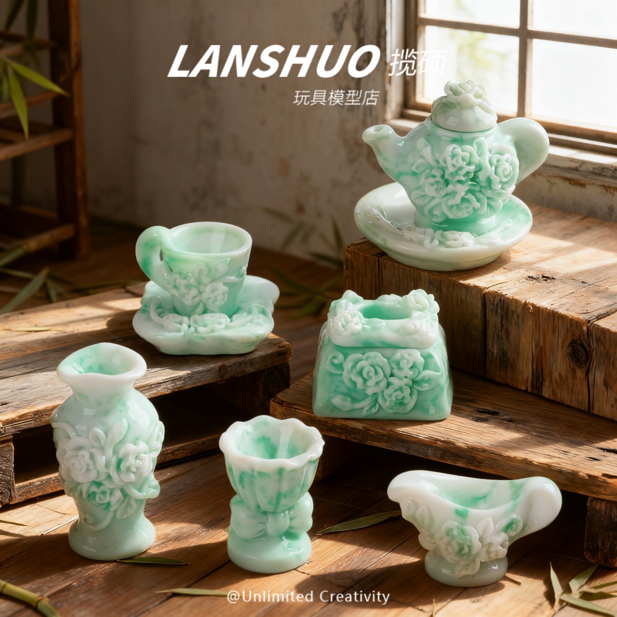 树脂仿真卡通青花瓷绿色茶具 DIY家居摆件材料自制家居造景小摆件