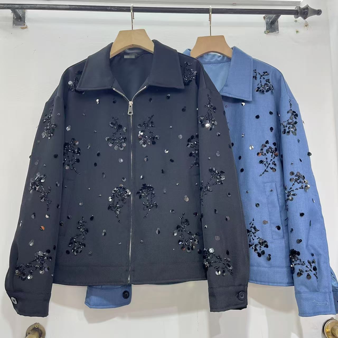 重工のスパンコールのデニムのコートの女性の潮2025新型の秋の服装はゆったりしていて、やせているヨーロッパ駅は古い長袖のジャケットをします。