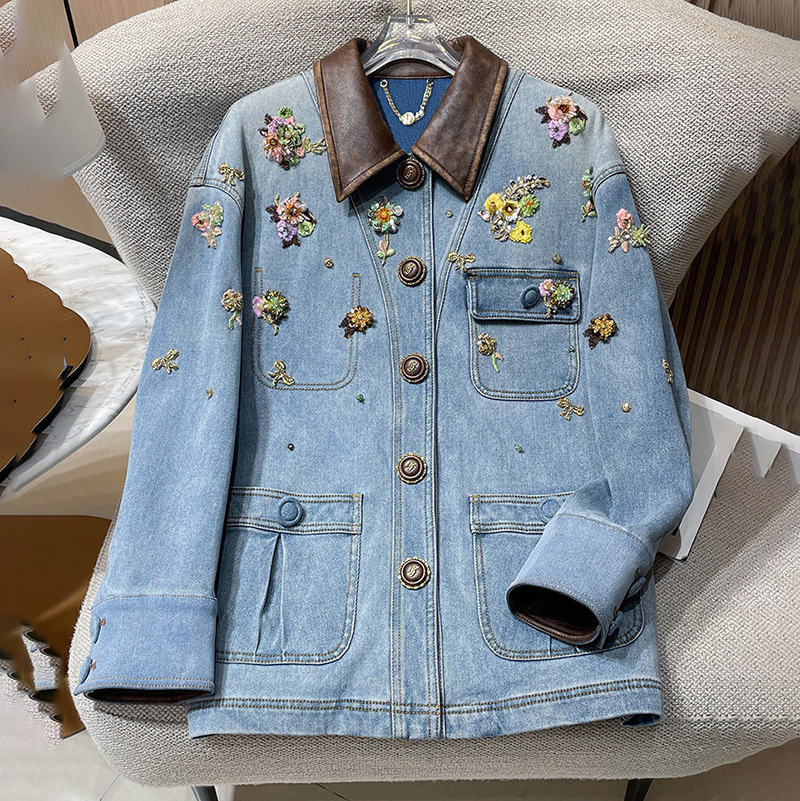 牛仔服上衣2025秋冬新款重工花朵钉珠亮片宽松显瘦翻领夹克外套女