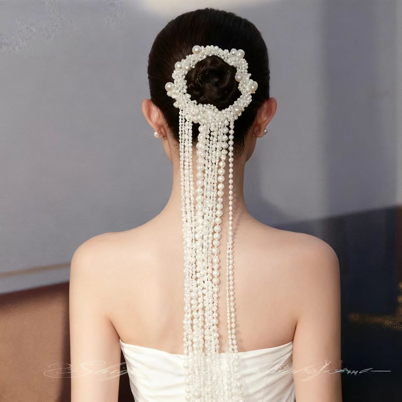 新款高级感白色仿珍珠头饰编织绑带马尾飘带流苏新娘发夹配饰发饰