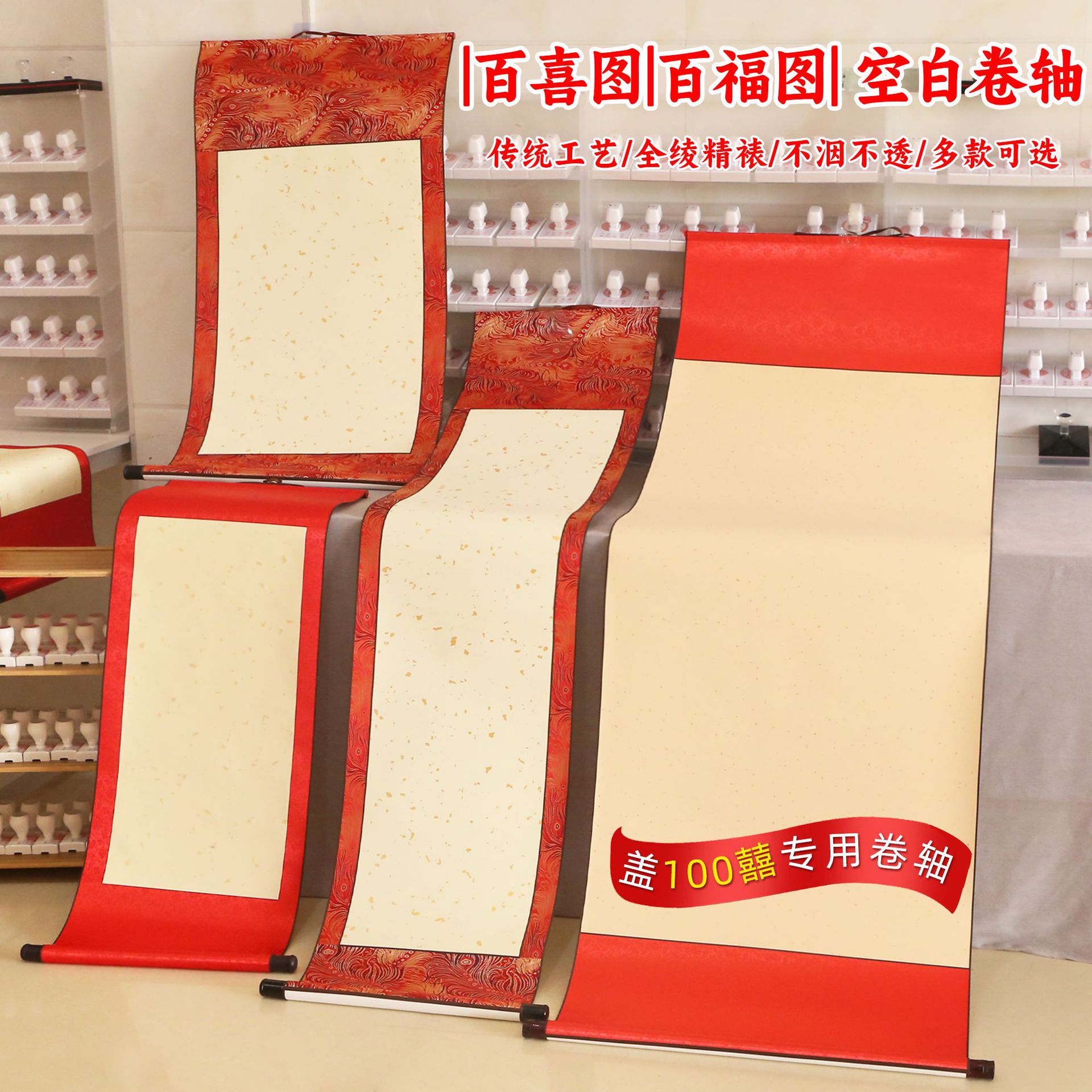 Baixitu スタンプ空白大ロールライスペーパー掛け軸アンティーク高級宋錦鳳尾布軸赤絹布掛け軸