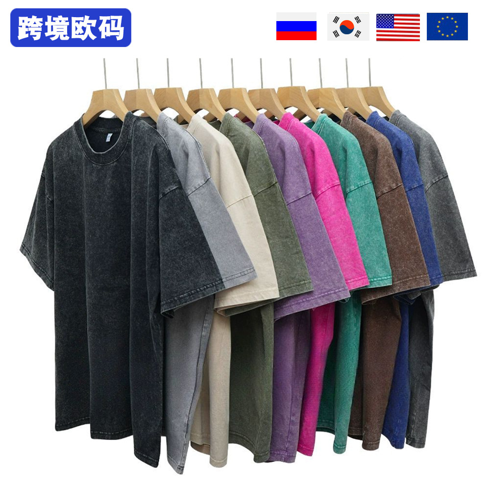 欧码洗水做旧T恤复古230g男士落肩上衣短袖复古做旧宽松oversize