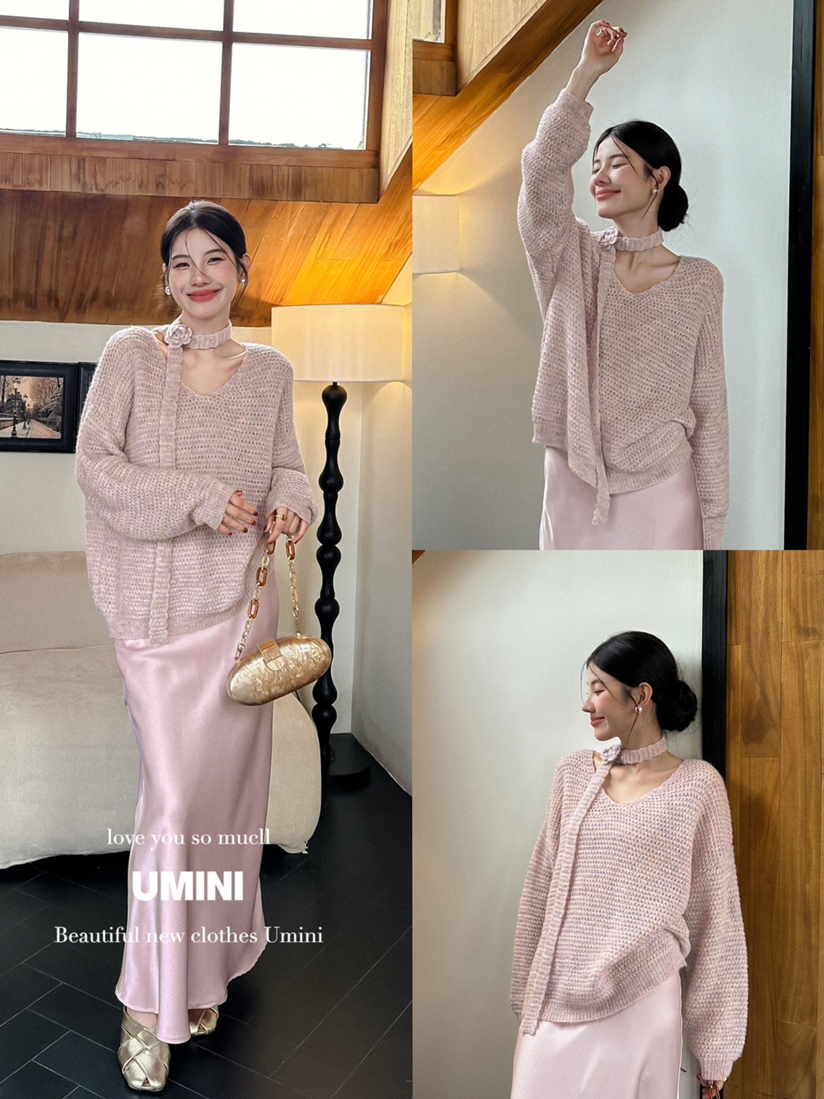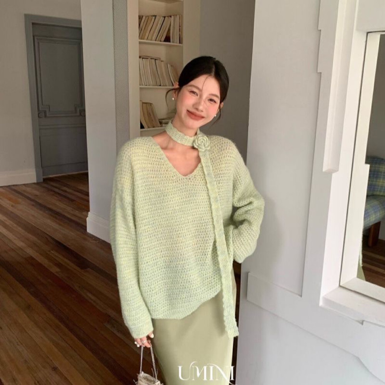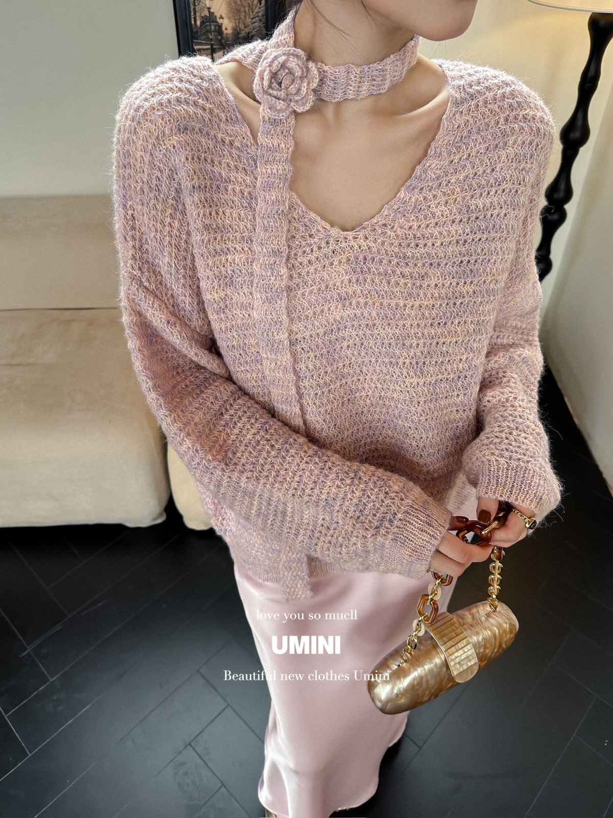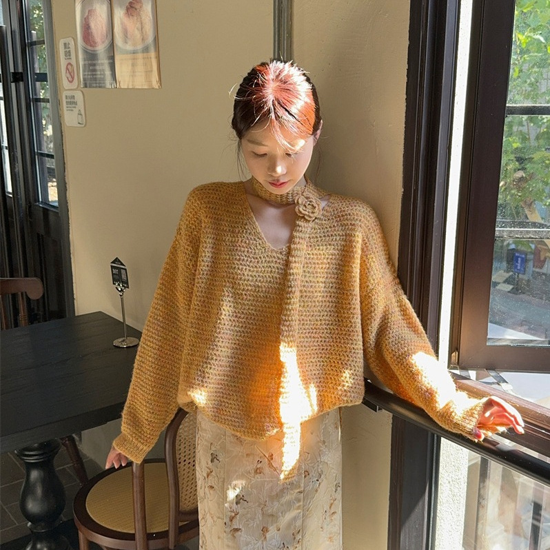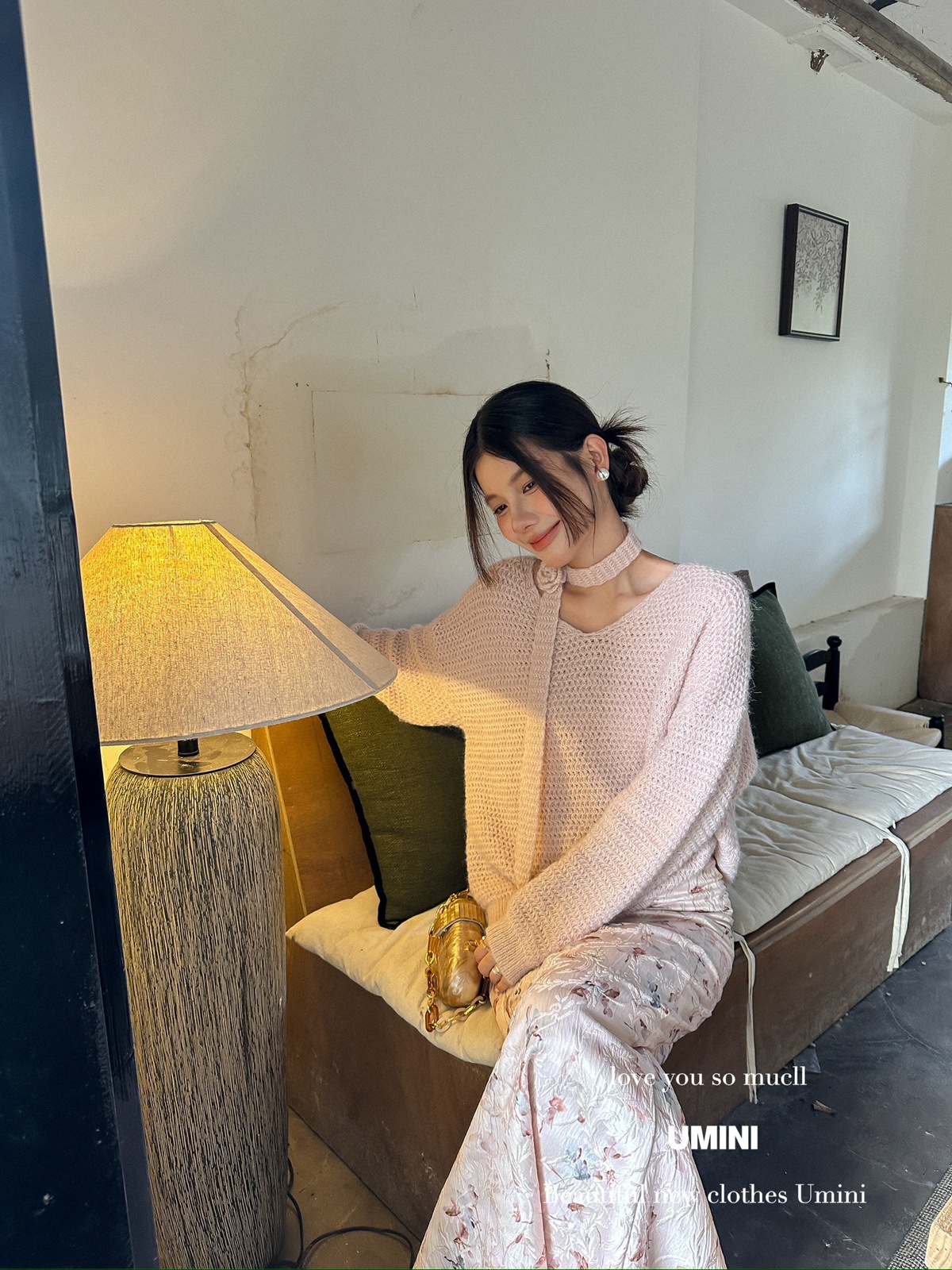 韩系宽松慵懒风秋季新款氛围感玫瑰花朵飘带V领针织衫显瘦毛衣女