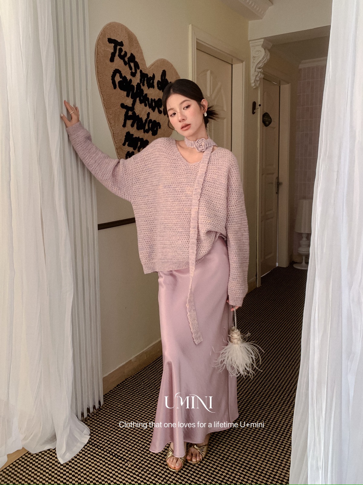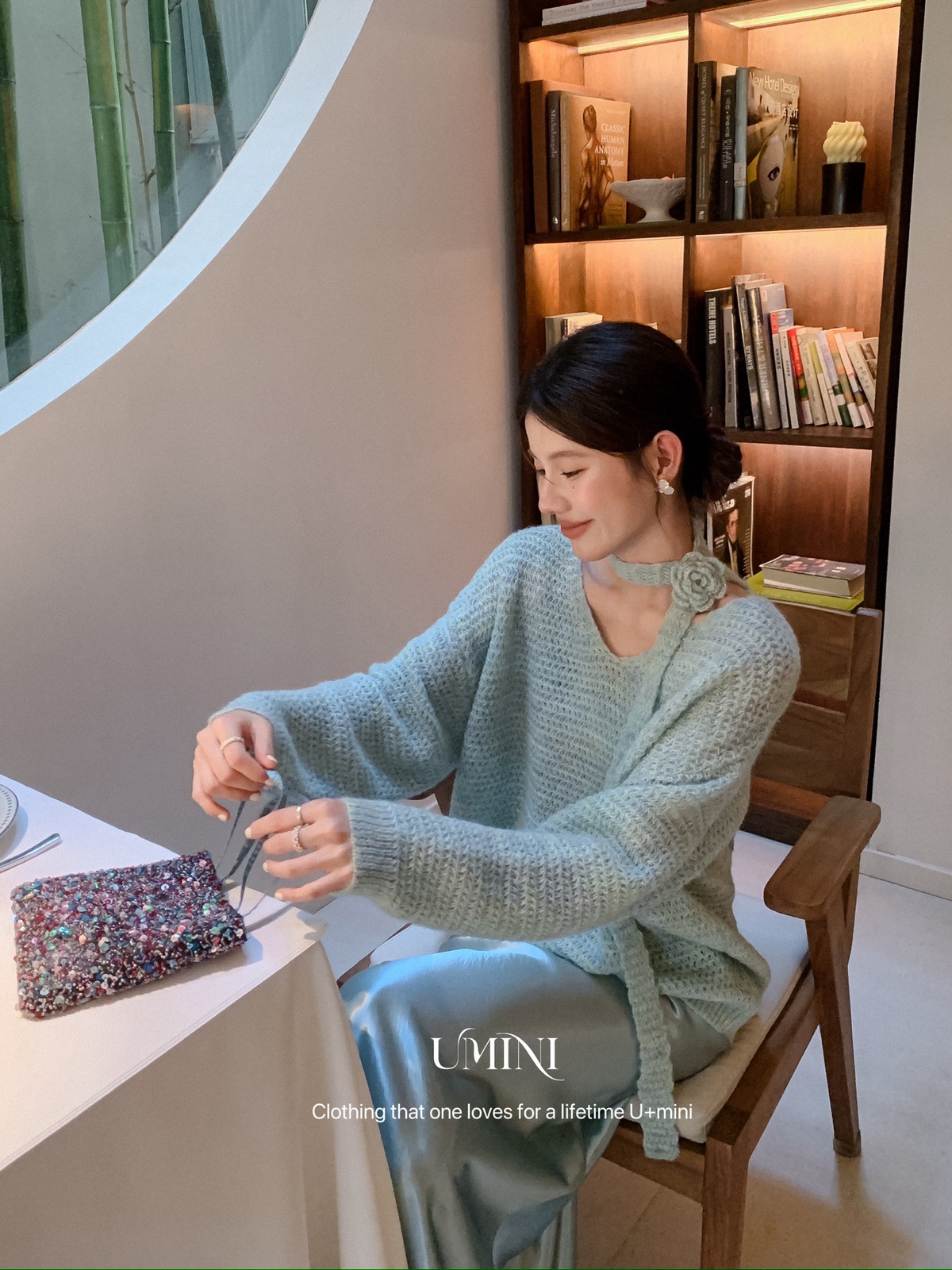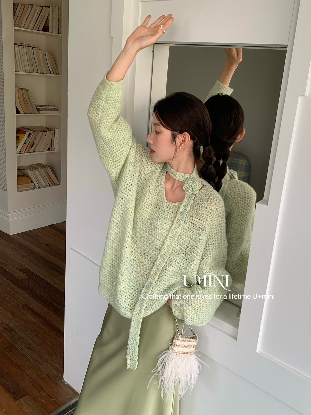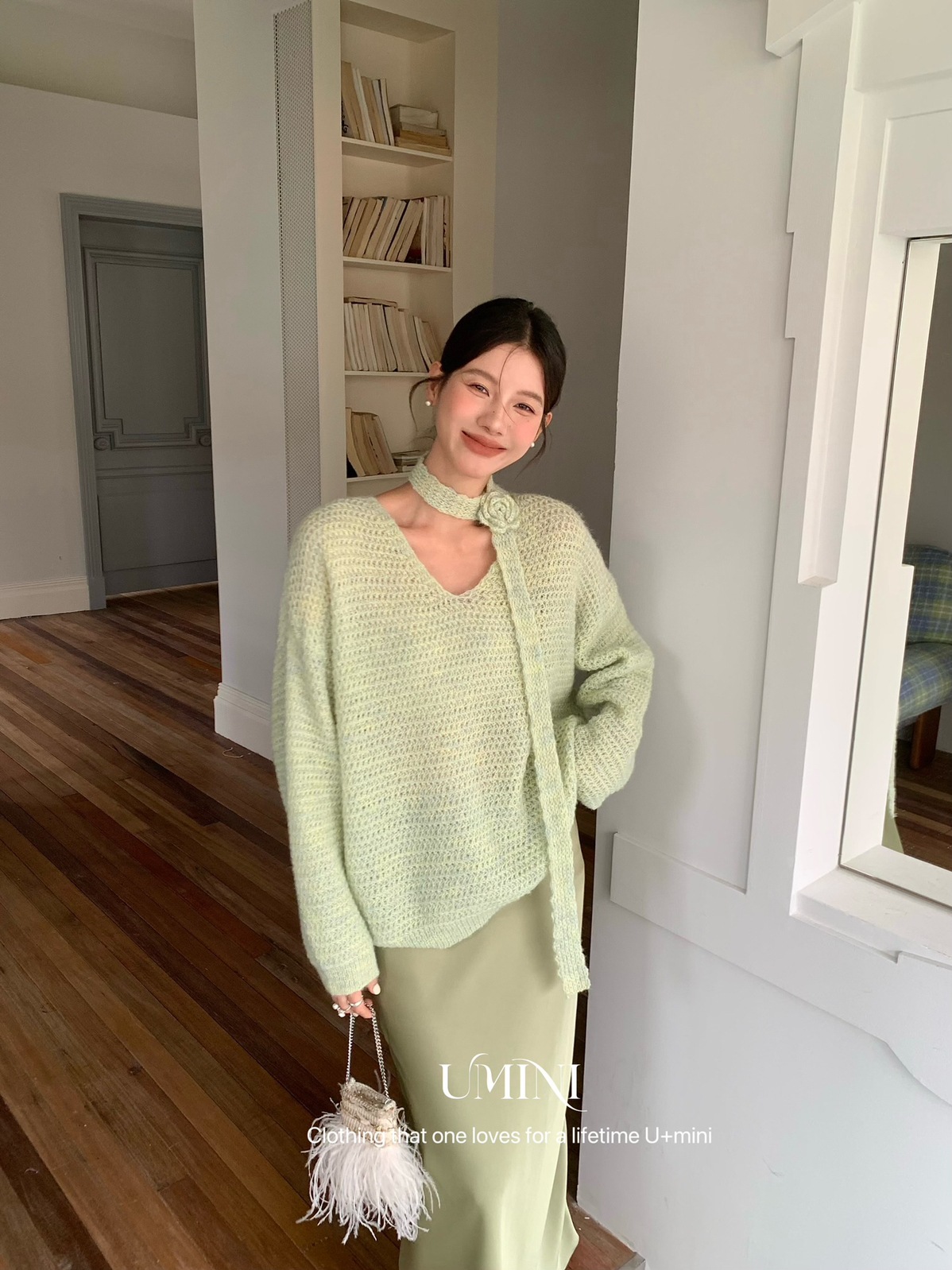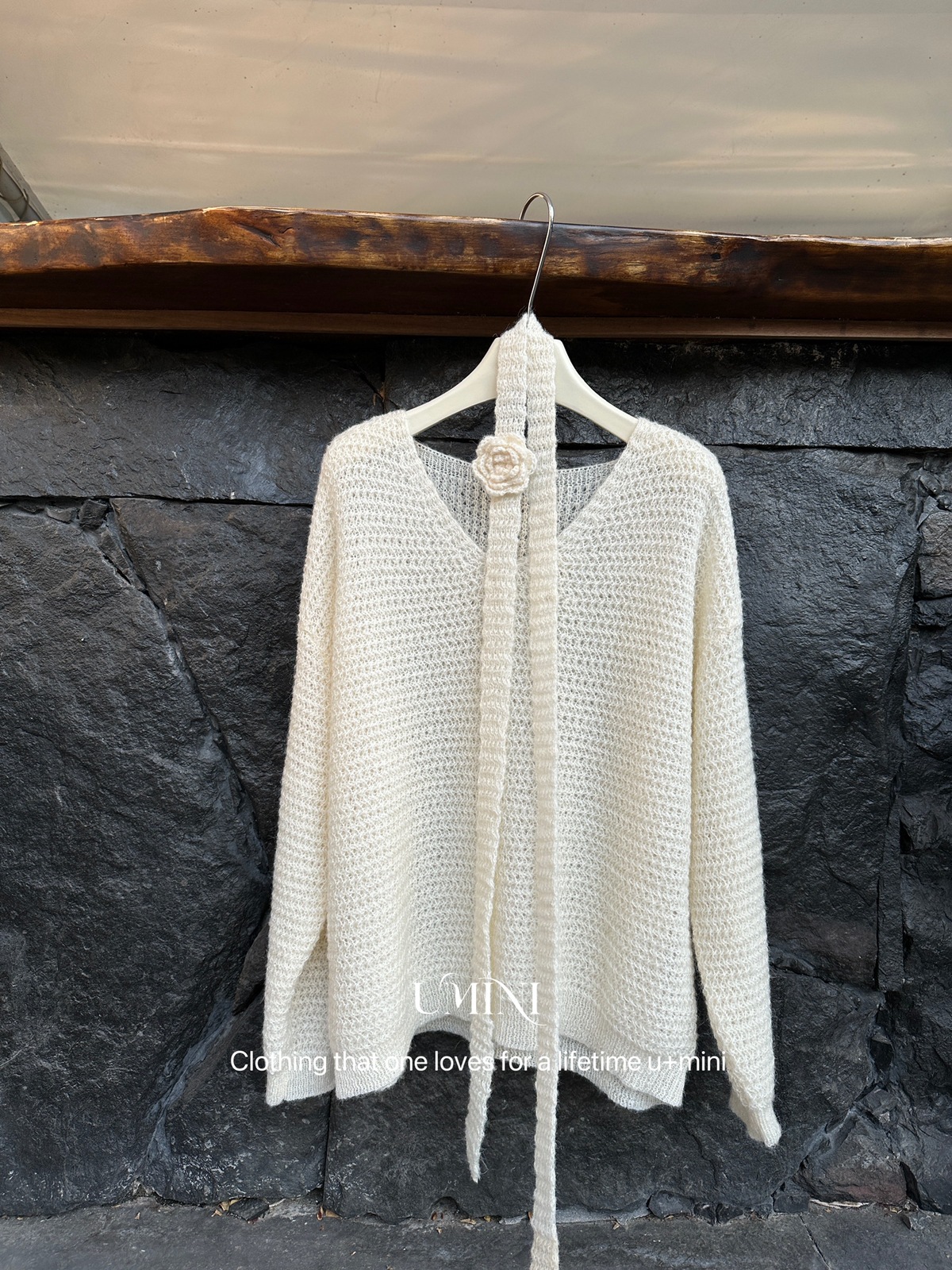 U+MINI 韓国風レイジーな雰囲気のバラの花リボンVネックセーター 暖かいセーター(ウール10%配合)