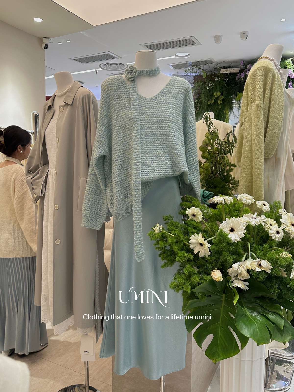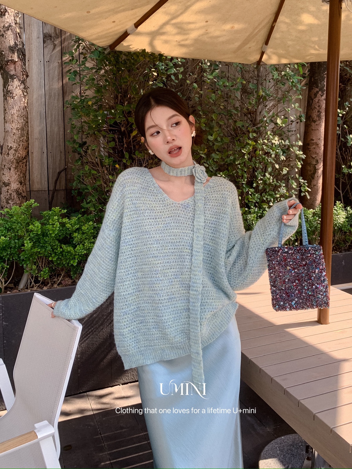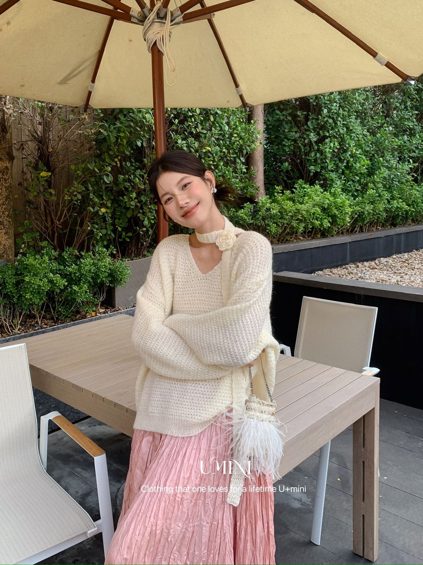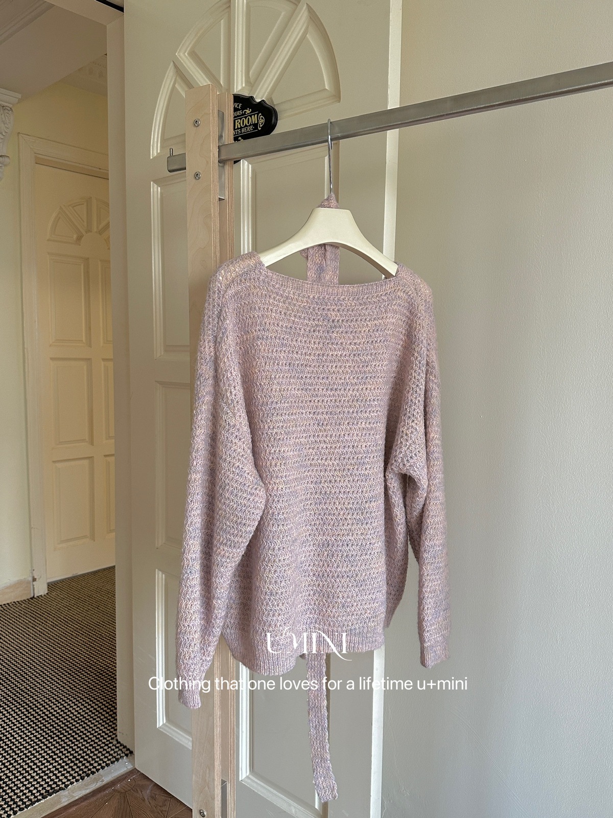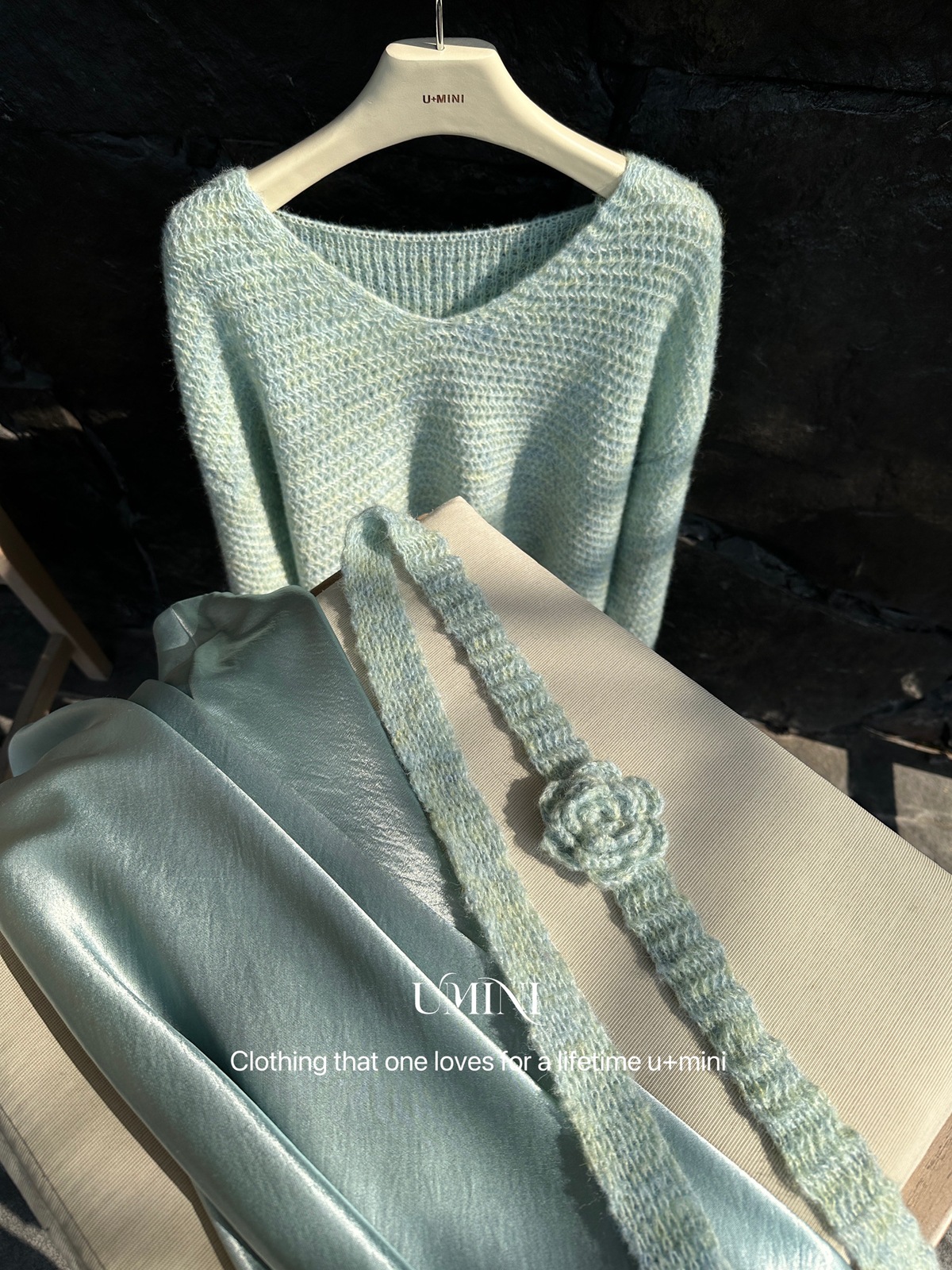 U+MINI 韓国風レイジーな雰囲気のバラの花リボンVネックセーター 暖かいセーター(ウール10%配合)