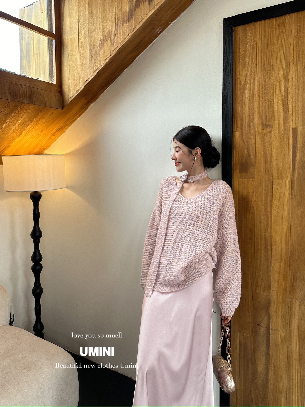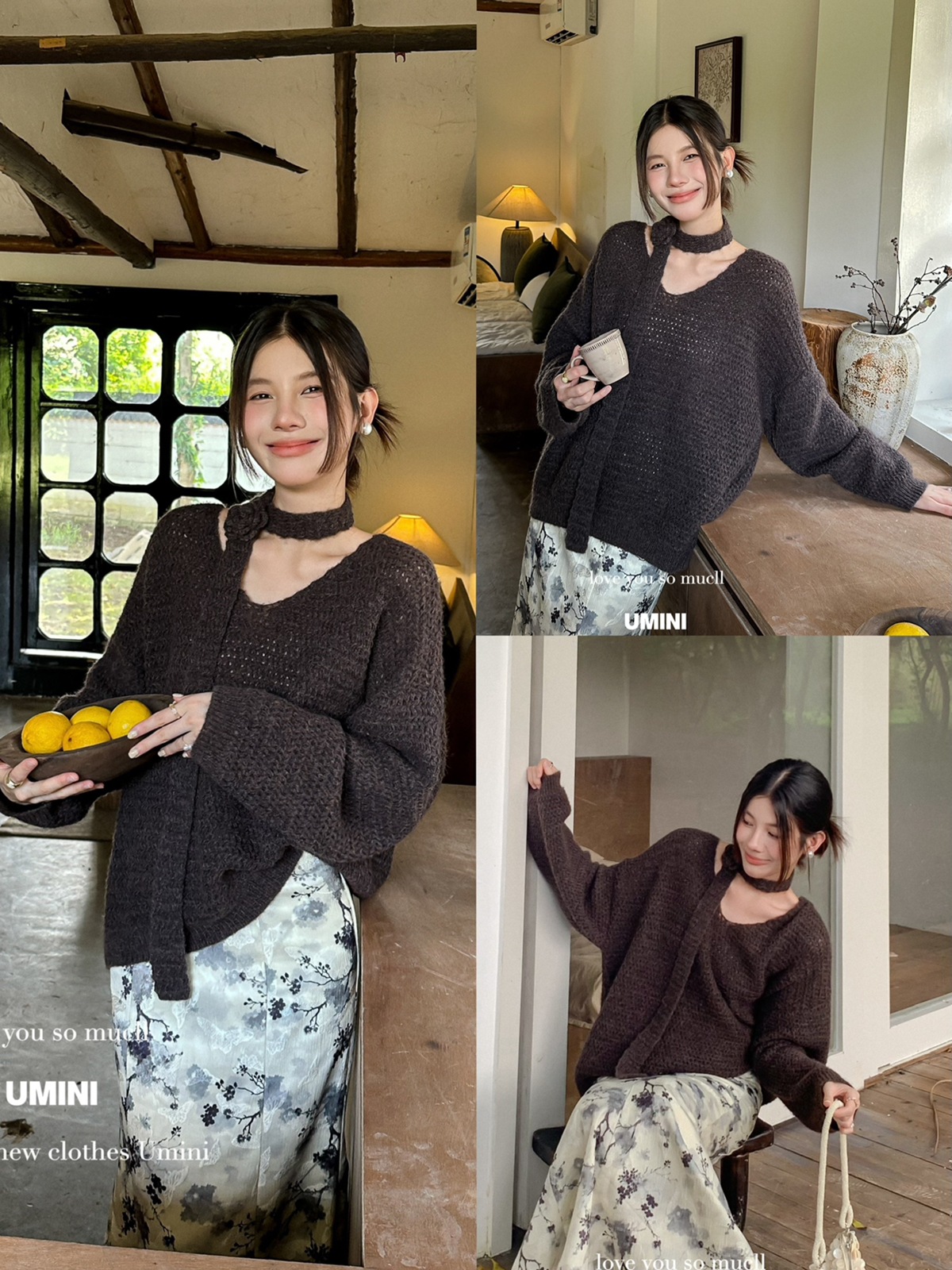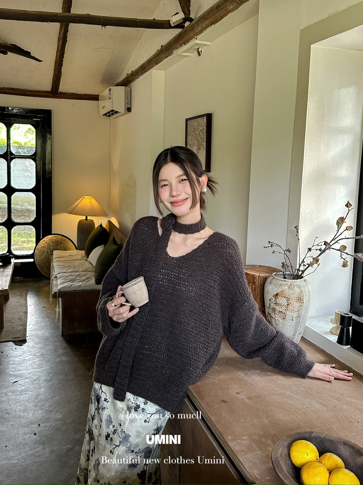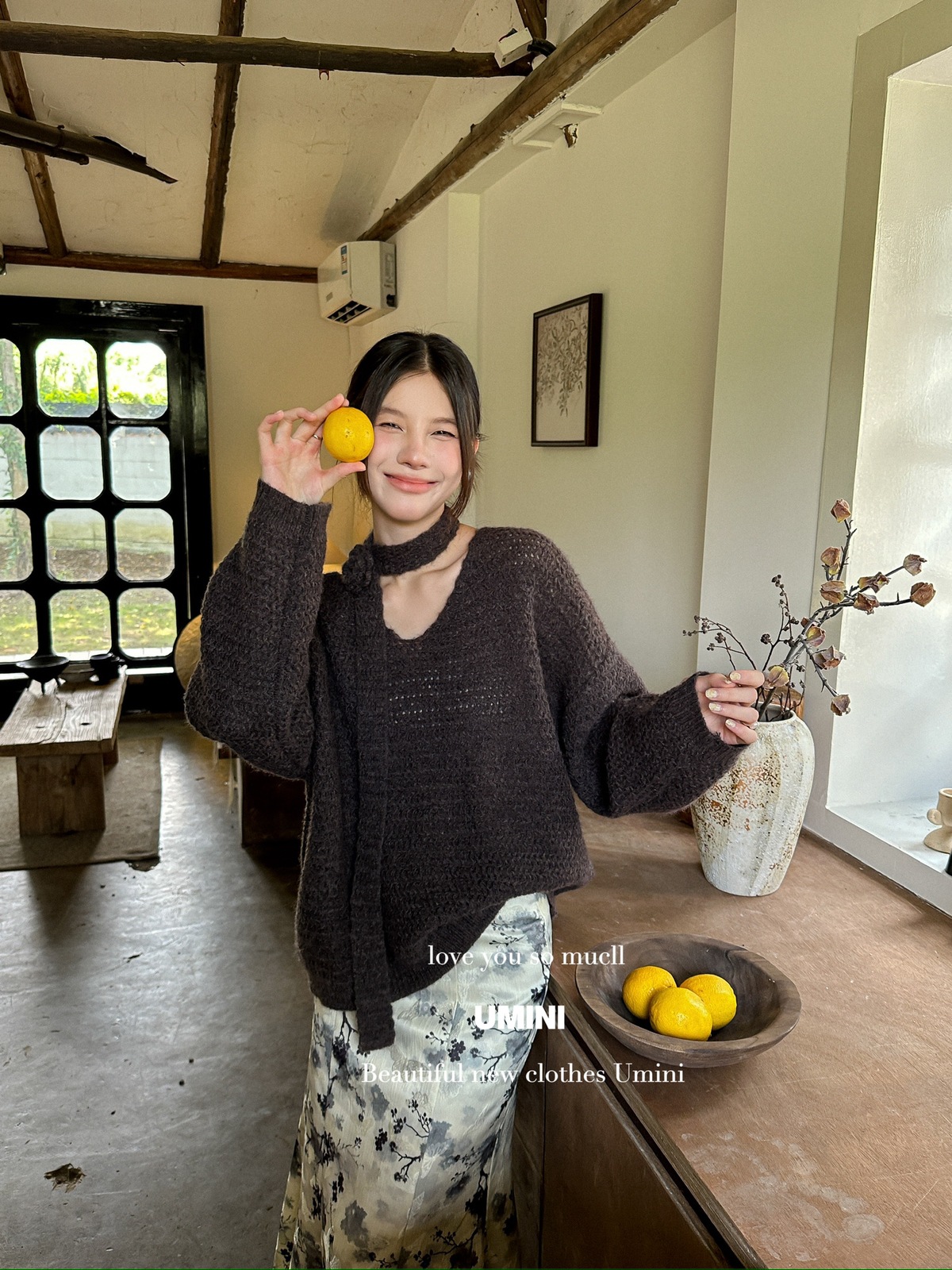红茶系挂脖飘带v领套头毛衣女秋冬针织衫氛围感气质上衣带围巾