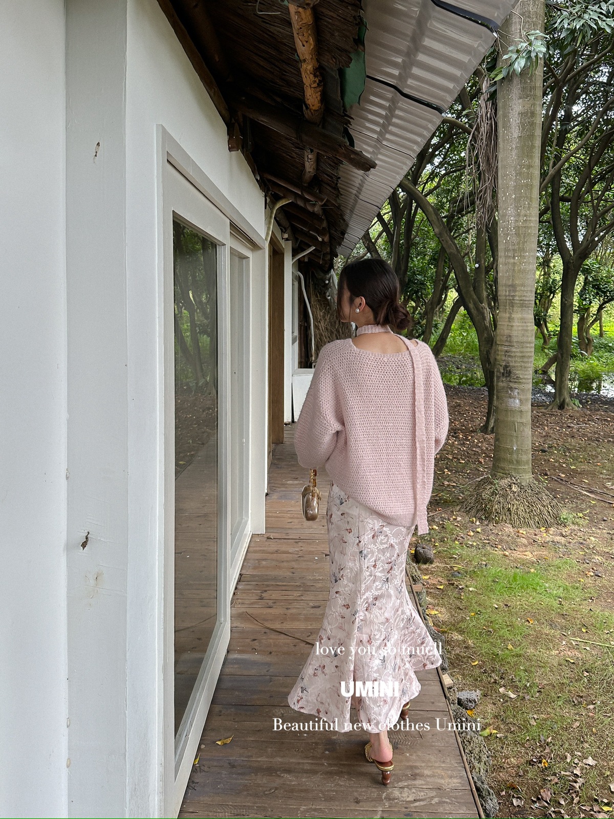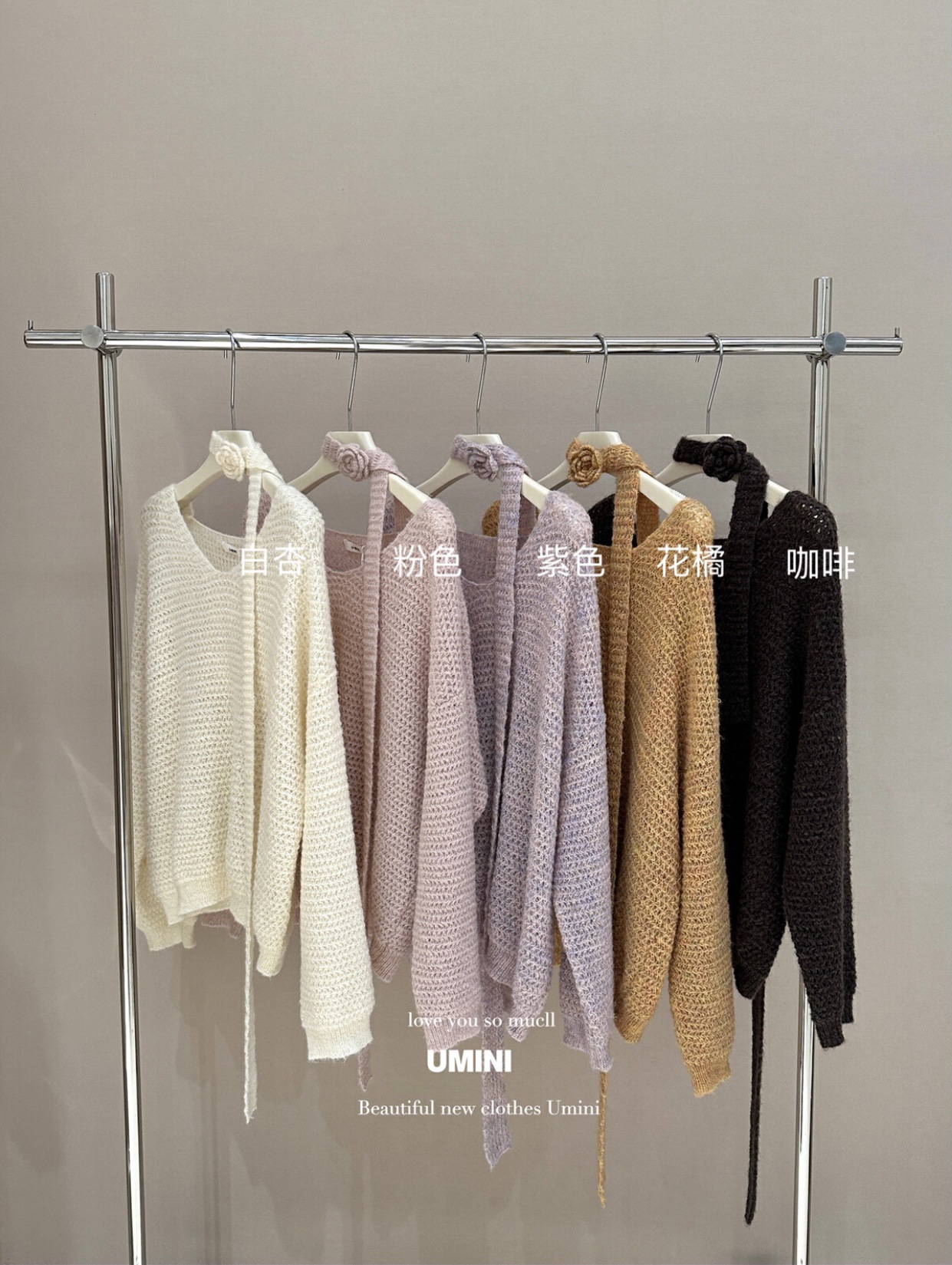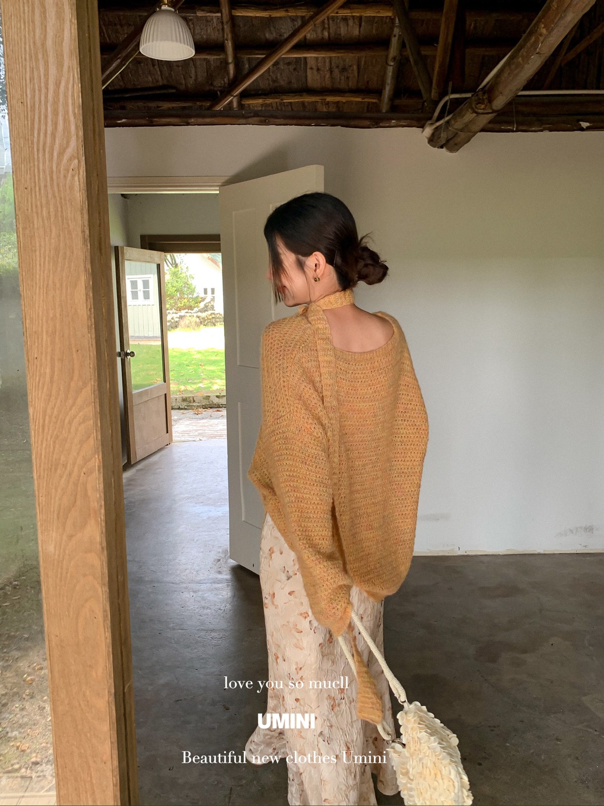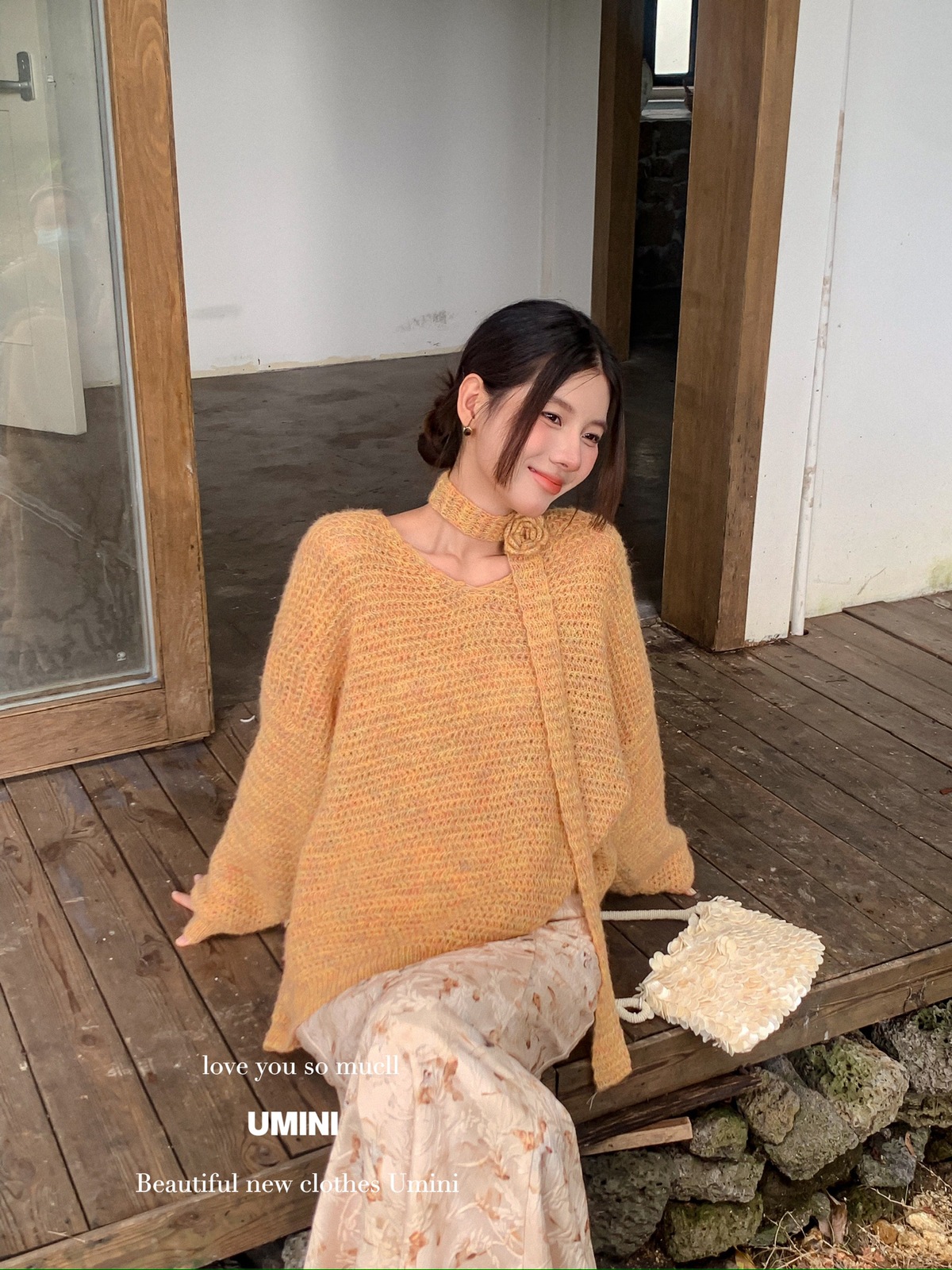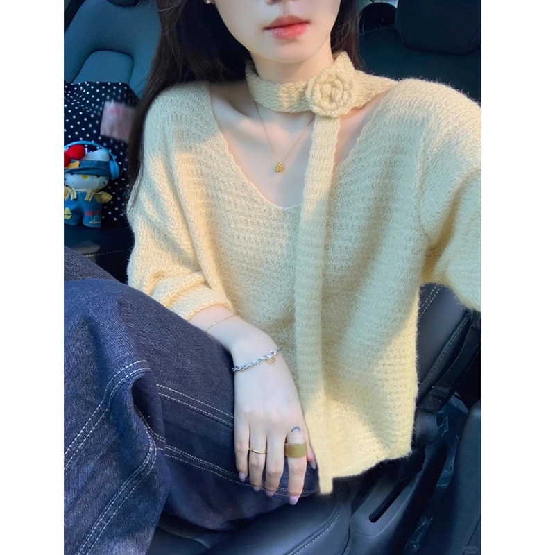 韩系黄色V领花朵飘带挂脖针织衫女早秋温柔风奶fufu软糯慵懒上衣
