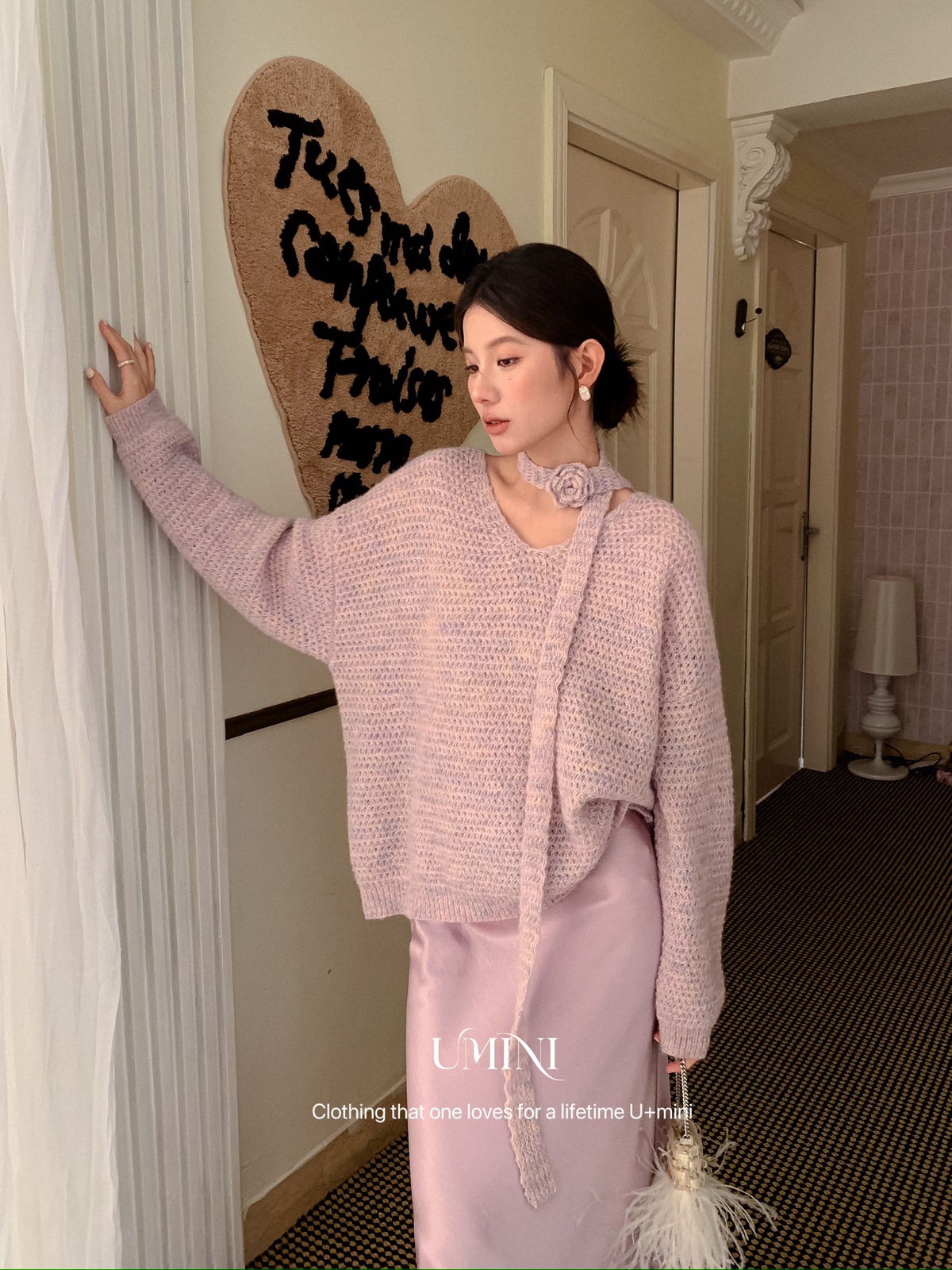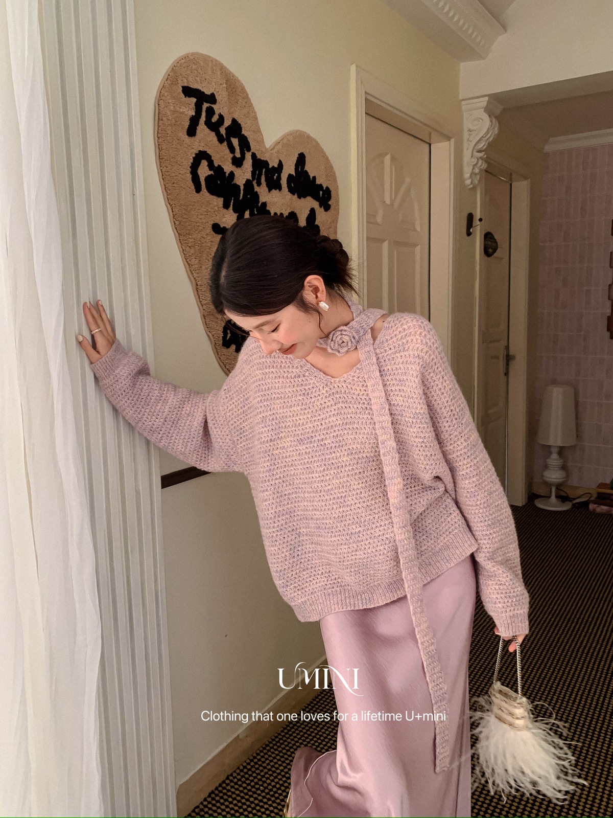 韩系春秋新款宽松慵懒风氛围感玫瑰花朵飘带V领针织衫显瘦毛衣女