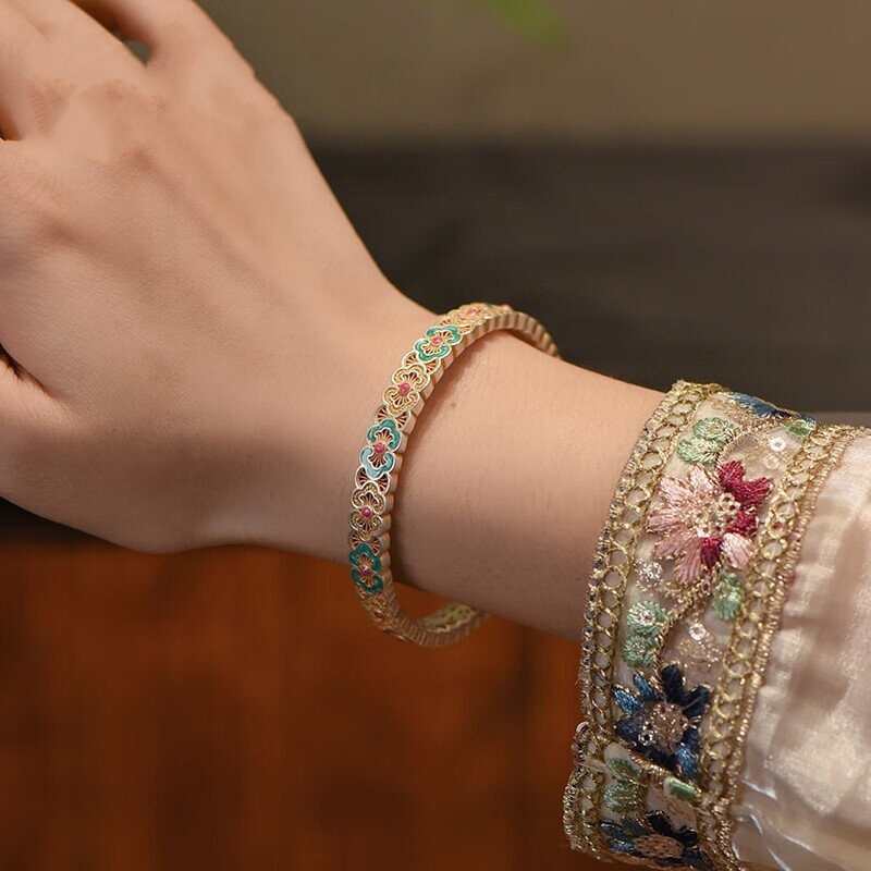 纯银手镯女时尚描金如意手镯新中式珐琅彩花丝镂空足银手镯女