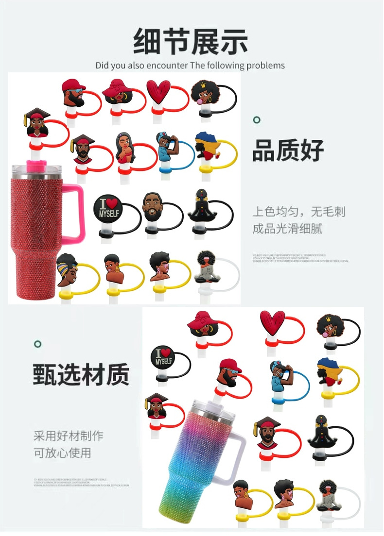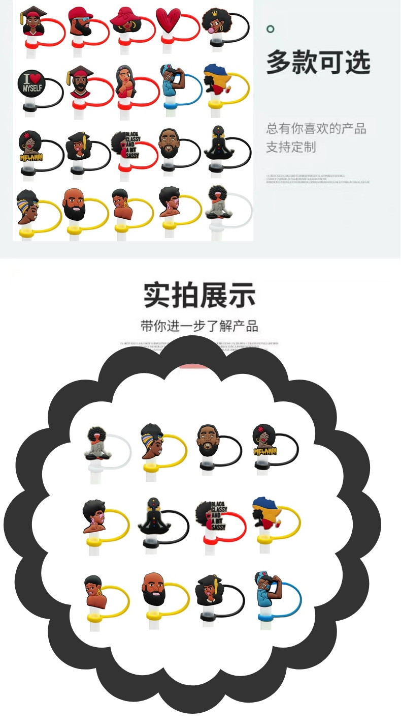 アマゾンの人気黒人少女シリーズストローキャップ10mm再利用可能ストロープラグ防塵ストローキャップ