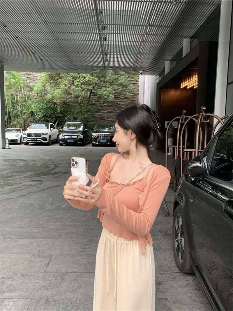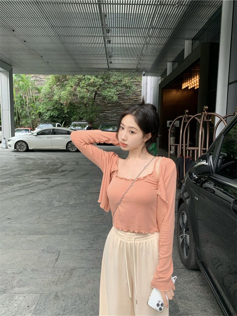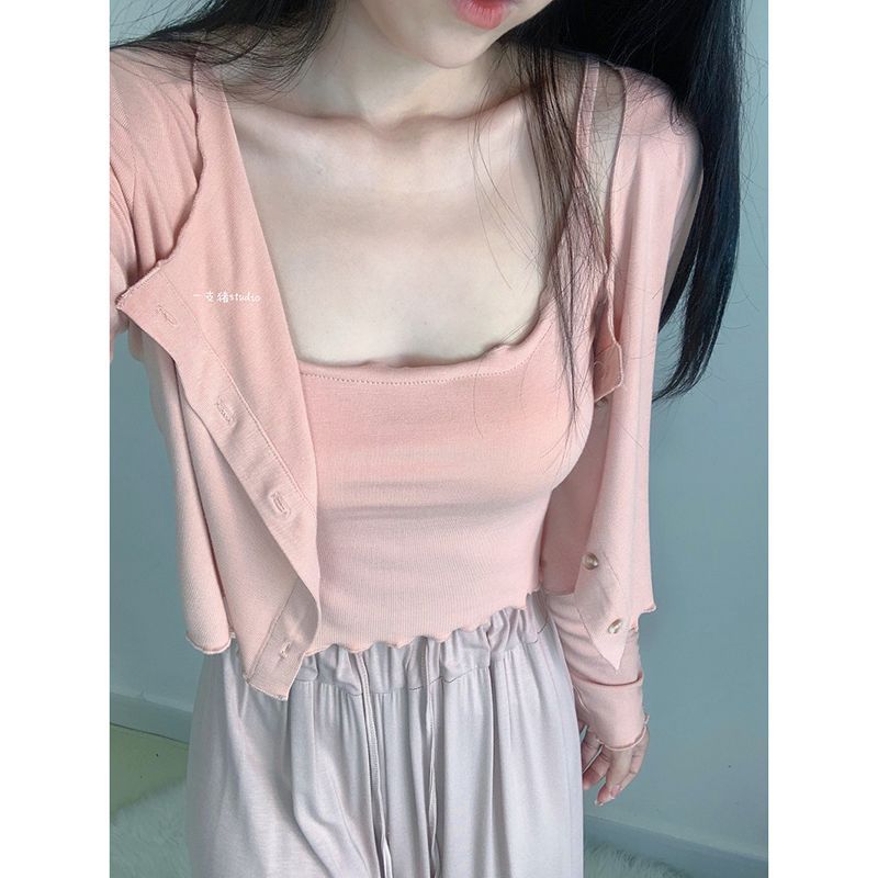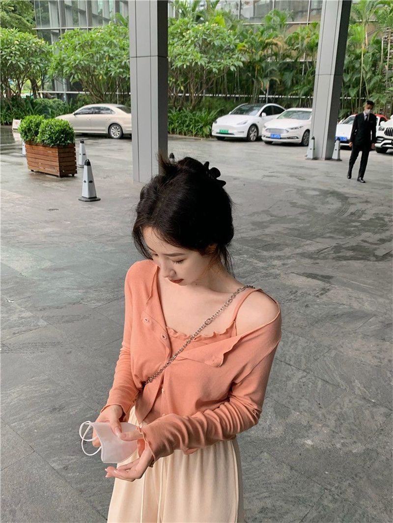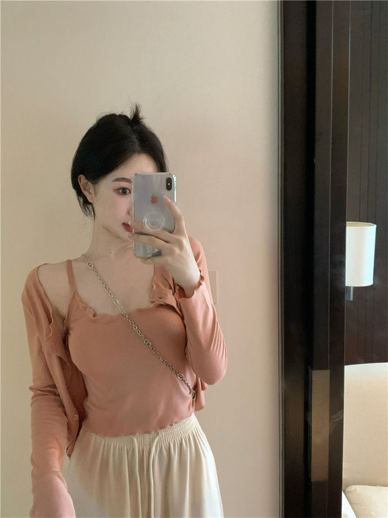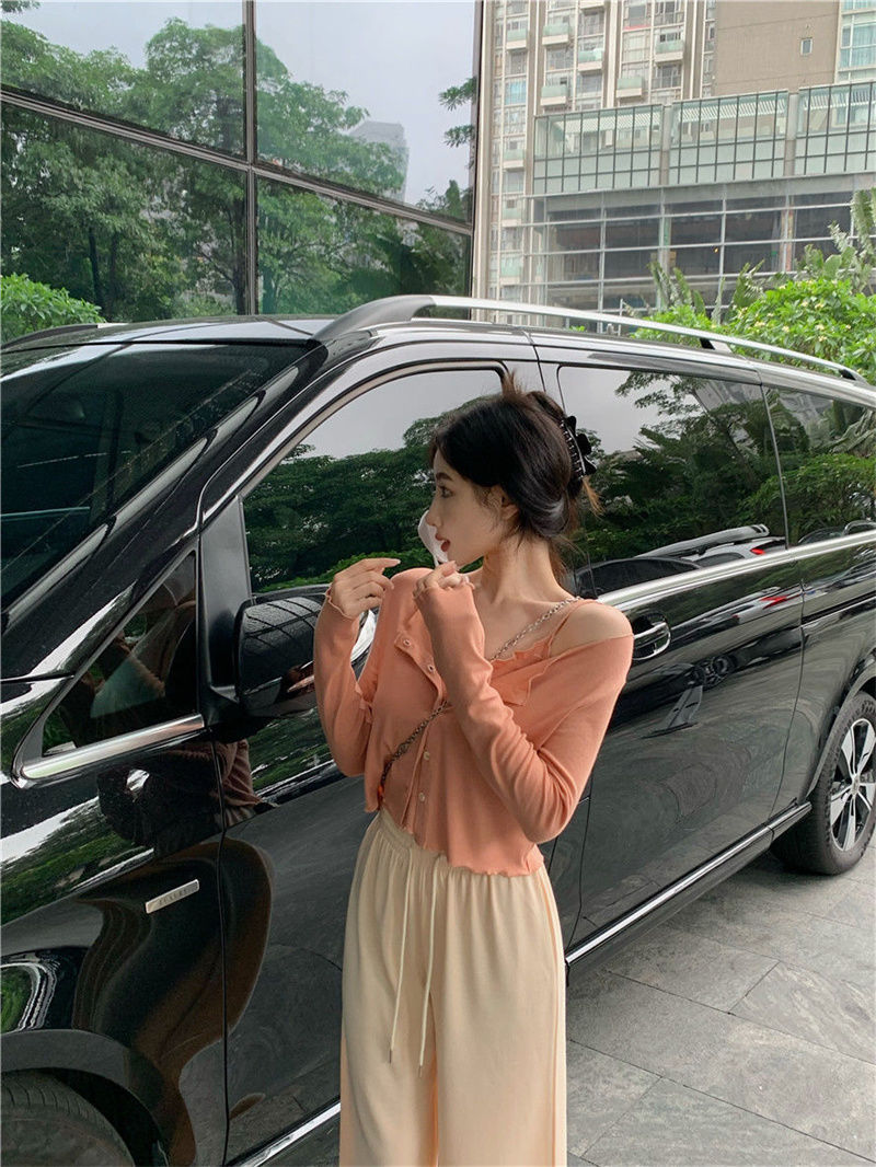 夏の気質の甘辛い風のストラップのベストの婦人服のデザイン感の修身はやせている長袖のカーディガンの上着の2つのセットを現します。