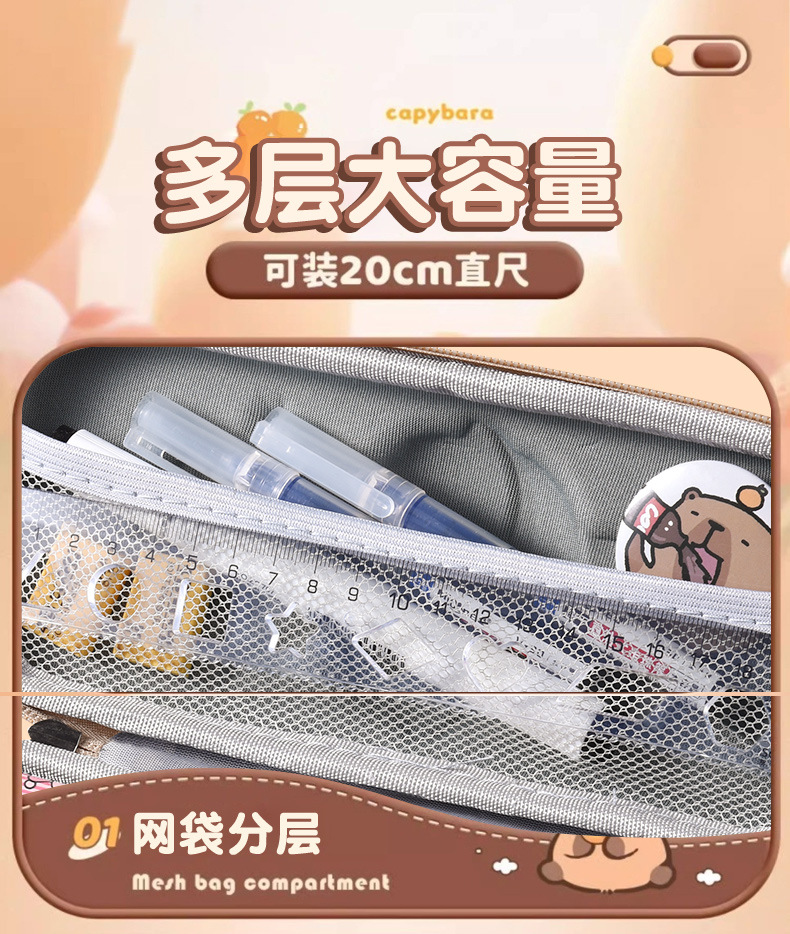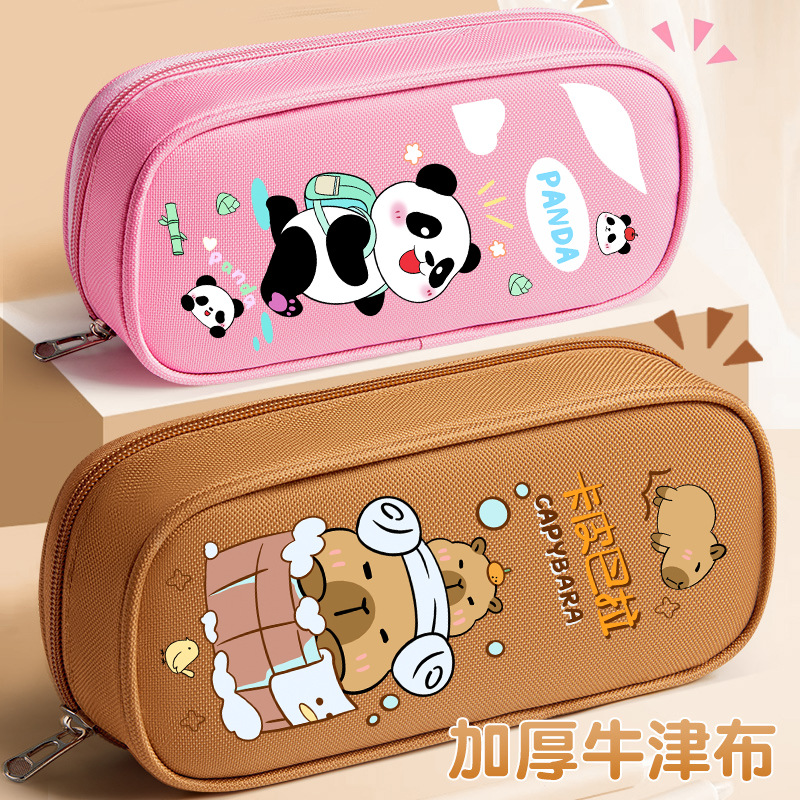 小学生向け人気カピバラ柄布製ペンケース、二層式シンプル大容量文房具入れ、漫画風鉛筆袋