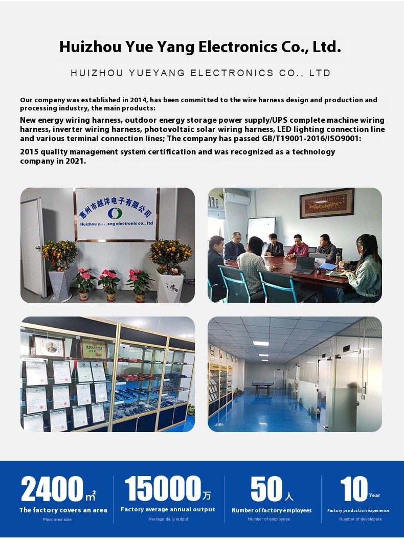 Focus on cable harness design, development and production, products are widely used in new energy, energy storage power supply, photovoltaic inverter, automotive Electronics, LED lighting and other fields. The company's main products include: